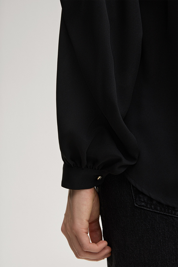 Geraffte Elemente und der moderne Mix aus Rundhals und V-Ausschnitt mit Bindeband verleihen der locker geschnittenen Bluse Brigida das stylishe Flair. Die langen Raglanärmel erhalten durch knöpfbare Abschlüsse ein stilvolles Finish, während der abgerundete Saum die feminine Optik hervorhebt. Das Piece ist ein Highlight zu Jeans und Anzughosen.