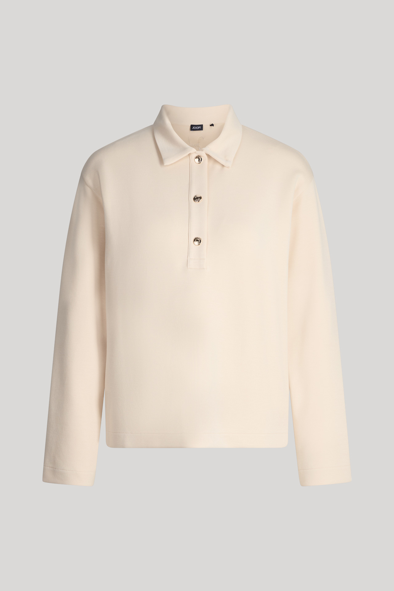 Das Sweatshirt Ticia erhält durch den Polokragen sowie die Knopfleiste mit logogeprägten Knöpfen in Goldoptik ein stilvolles Upgrade. Lange Ärmel und doppelt vernähte Abschlüsse runden das Piece ab. Für angenehmen Tragekomfort sorgt die Verarbeitung aus weicher Modalmischung.