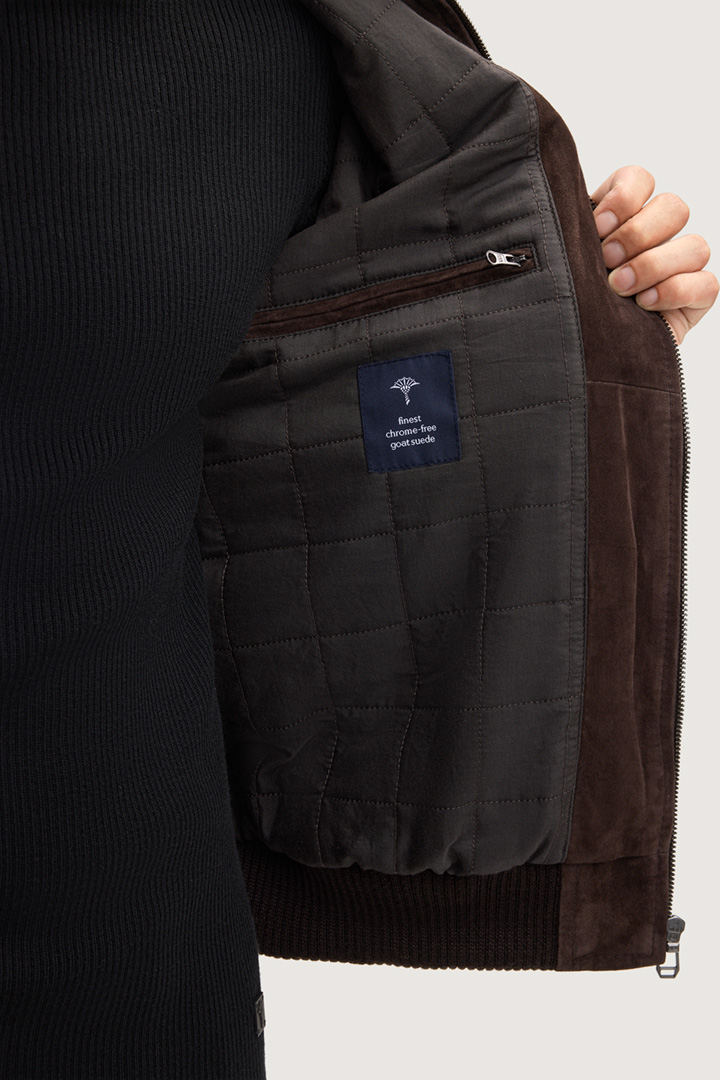 Pures Ziegenveloursleder zeichnet die Lederjacke Merin als Key Piece für den Look aus. Das moderne Design heben der Umlegekragen und der durchgehende Zipper hervor, stimmig ergänzt durch seitliche Leistentaschen. Ein komfortables Finish verleihen die Rippstrickbündchen an den Ärmeln und am Saumabschluss.