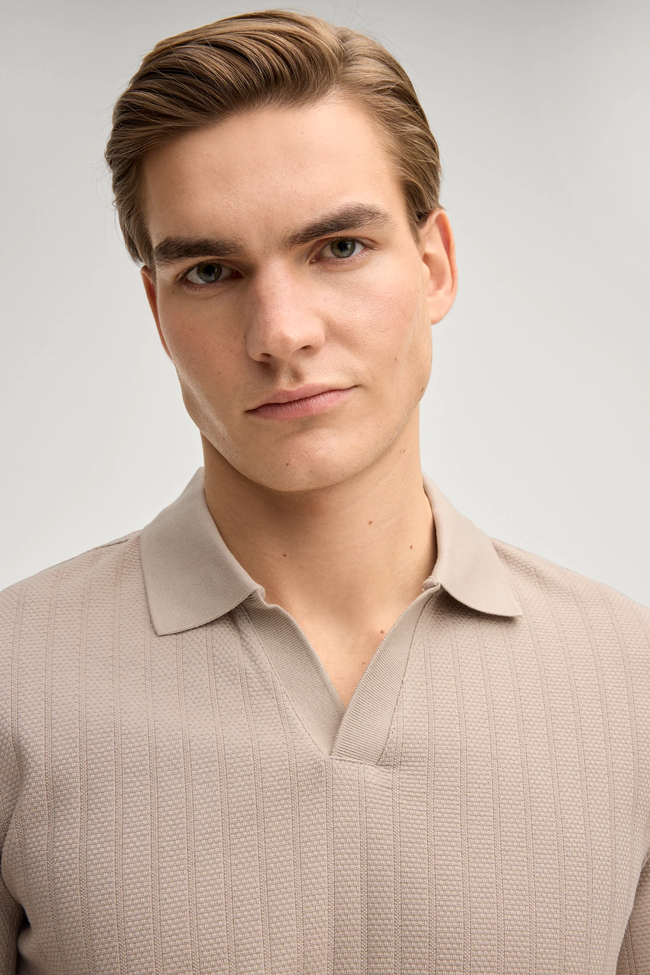• Polokragen mit kurzem V-Ausschnitt