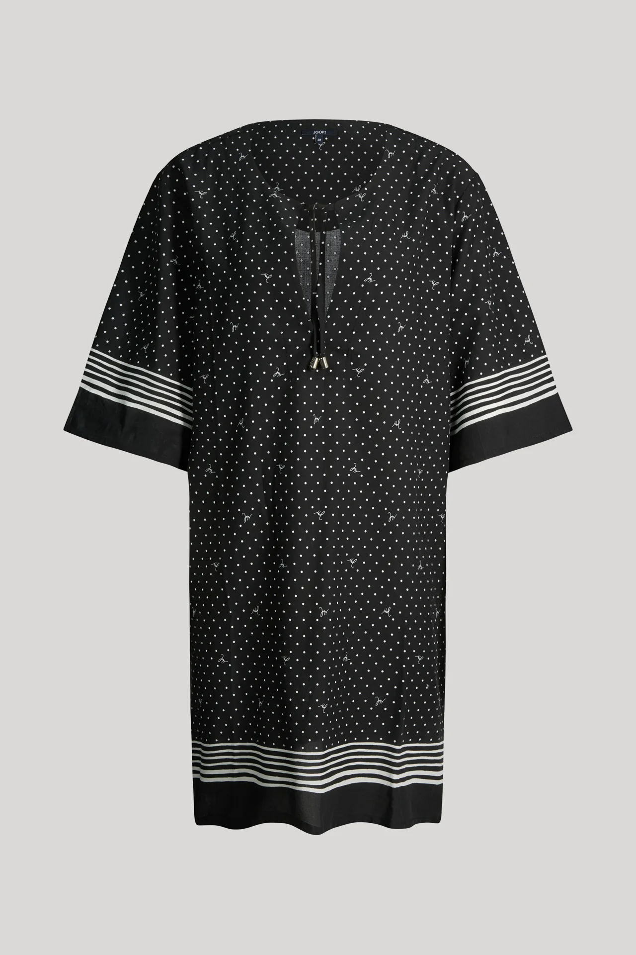 Als Highlight für jeden Sommerund Strandurlaub begeistert das Tunika-Strandkleid der Serie Brismar Beach. Der moderne Mustermix aus Punkten, Streifen sowie integrierten Logo-Schriftzügen zeichnet den ikonischen Style aus. Raffinierte Details schenken lockere Dreiviertelärmel sowie der Ausschnitt mit justierbarem Bindeband. Für komfortable Leichtigkeit sorgt die Verarbeitung aus Baumwolle mit Modal.