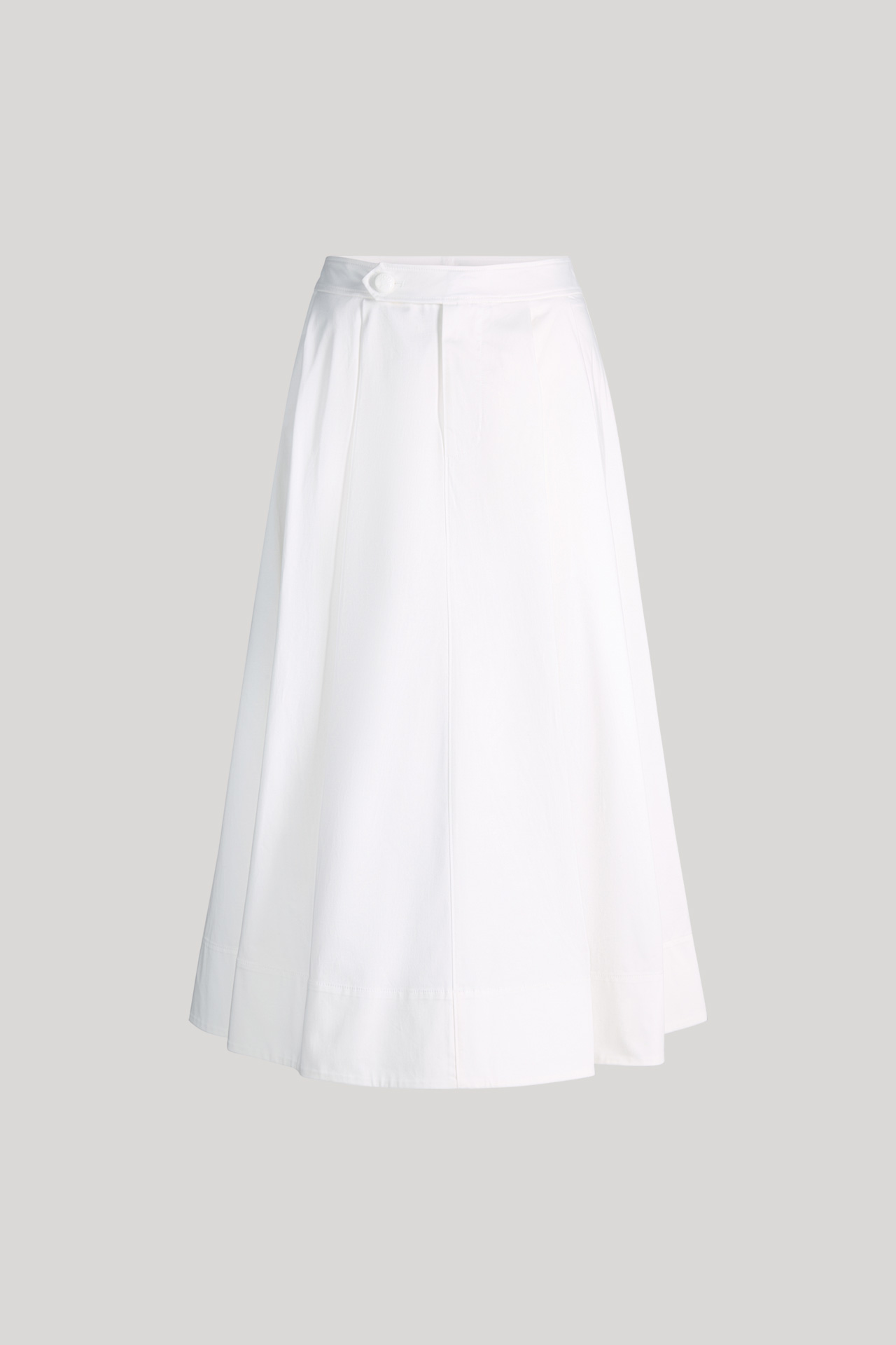 Der unifarbene Rock Sagira überzeugt mit hoch taillierter A-Linien-Silhouette und knöchellangem Schnitt. Der versetzte Knopfriegel, frontale Falten und seitliche Eingrifftaschen zeichnen das feminine Design aus. Puren Tragekomfort bietet die Qualität aus Baumwollstretch. Als sommerliche Variante passen luftige Shirts und Blusen sowie Ballerinas und akzentuierte Accessoires.