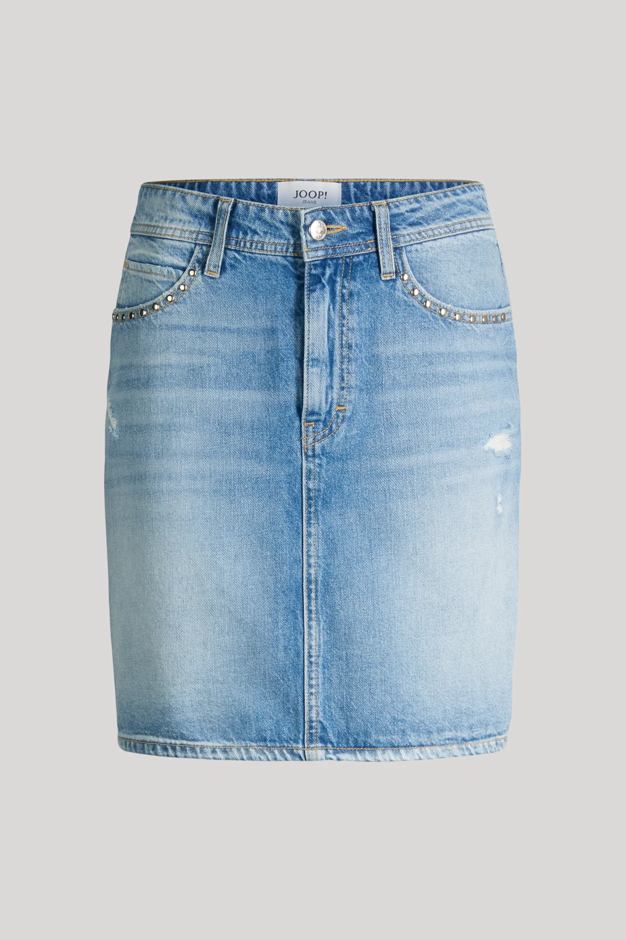 Ziersteine an den Fronttaschen zeichnen den stylishen Look des Jeansrocks Rosalie aus. Waschungsund Destroyed-Effekte verleihen lässige Akzente, während klassische Gürtelschlaufen am Bund ein flexibles Finish bieten. Für angenehmen Tragekomfort sorgt leichter Denim aus reiner Baumwolle.