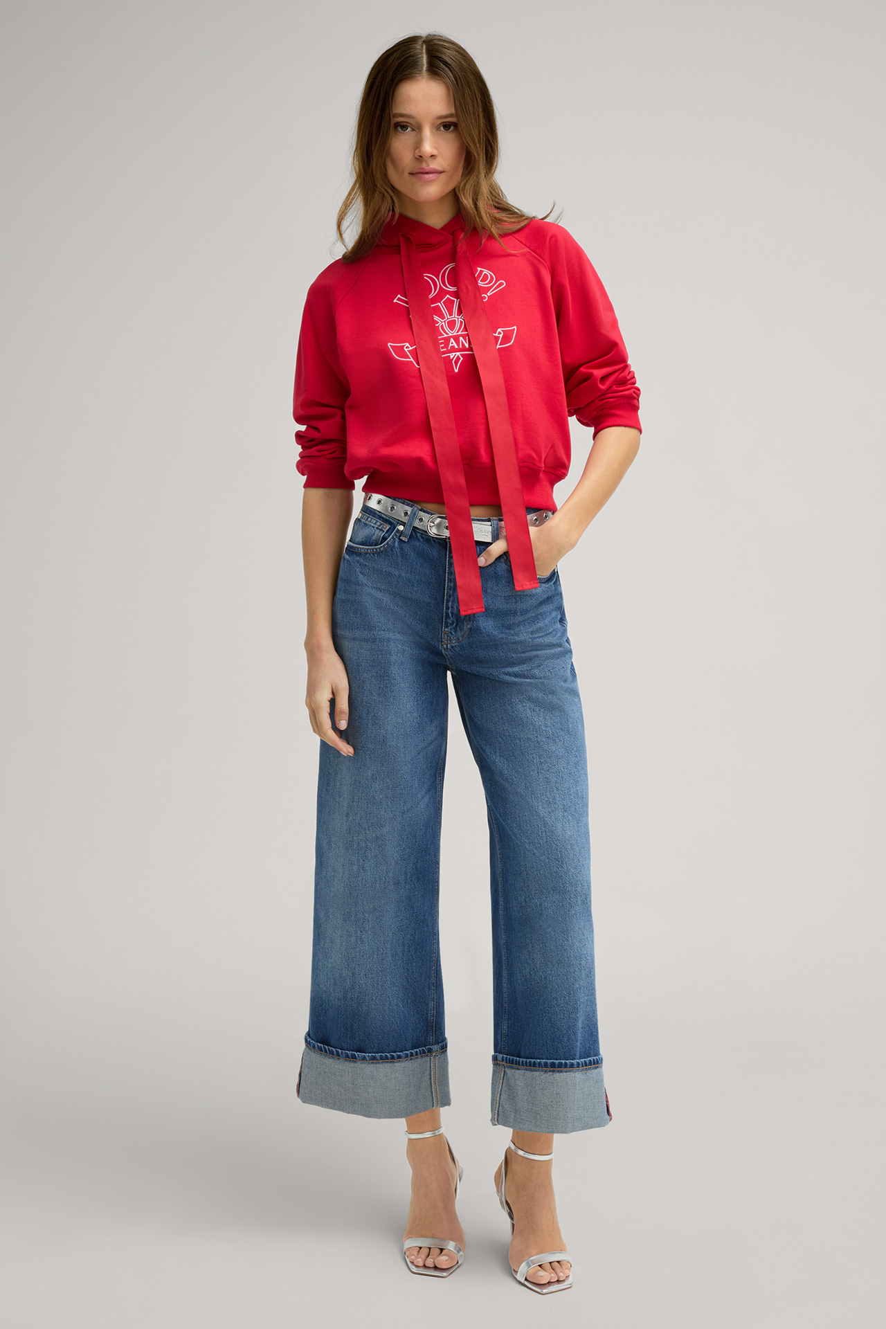 These jeans in a relaxed fit with a cropped length will win you over with their casual look. Fixed turn-ups are the hallmark of this piece, classically complemented by the five-pocket design and belt loops. A leather logo patch with flag and logo-embossed studs add a touch of signature flair. In a pure cotton quality.