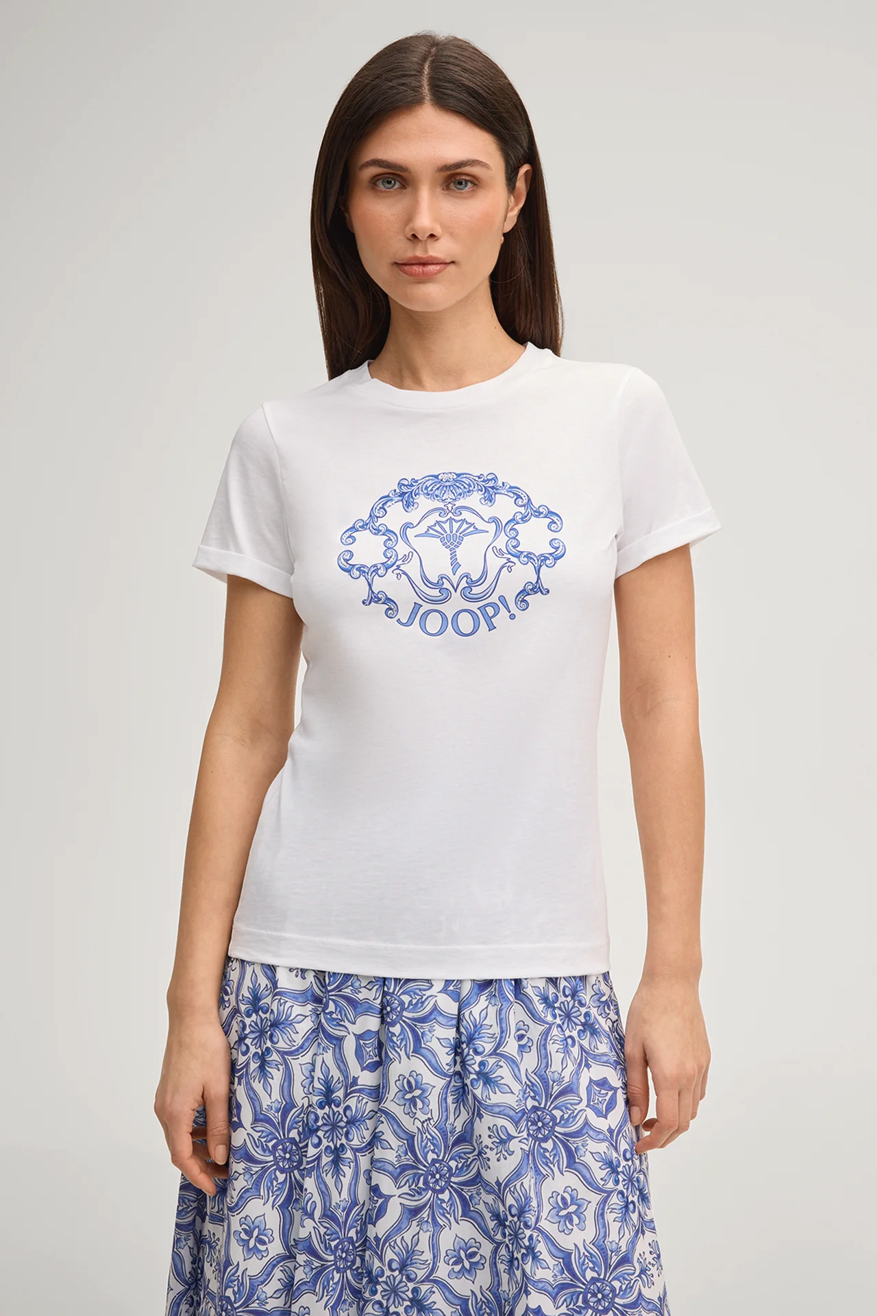 The Tulya T-shirt with logo emblem front print gives any outfit an eyecatcher. The round neckline and short sleeves with cuffs give it a feminine look. The pure cotton fabric ensures comfort.