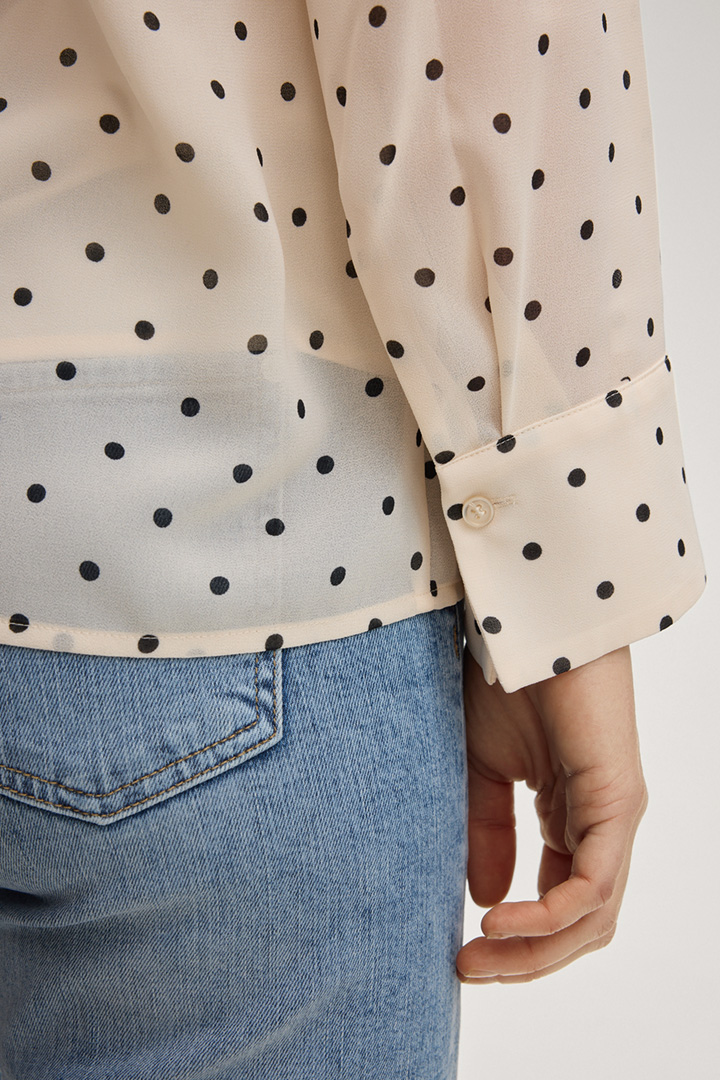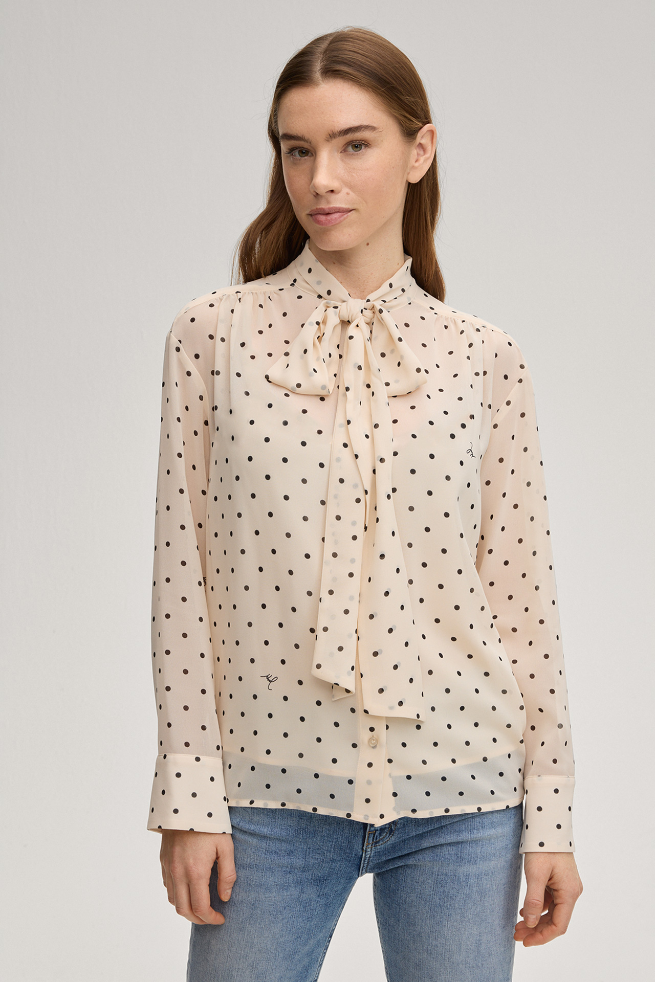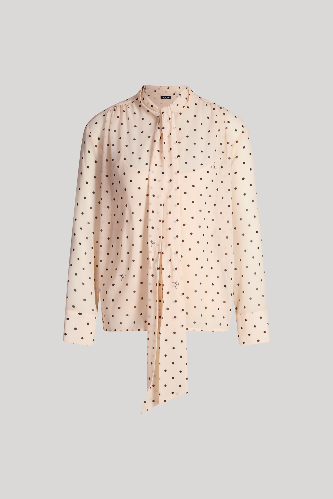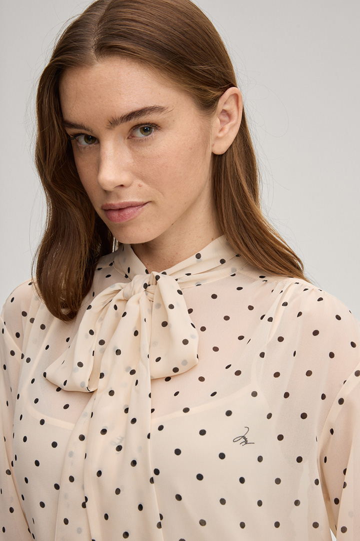 Mit Tupfen und feinen Logo-Details begeistert die Chiffon-Bluse Bo als Eyecatcher. Durch den Schleifenkragen erhält das Design einen raffinierten Akzent, stilvoll ergänzt durch Ärmelmanschetten. Für das komfortable Finish sorgt ein integriertes Top.