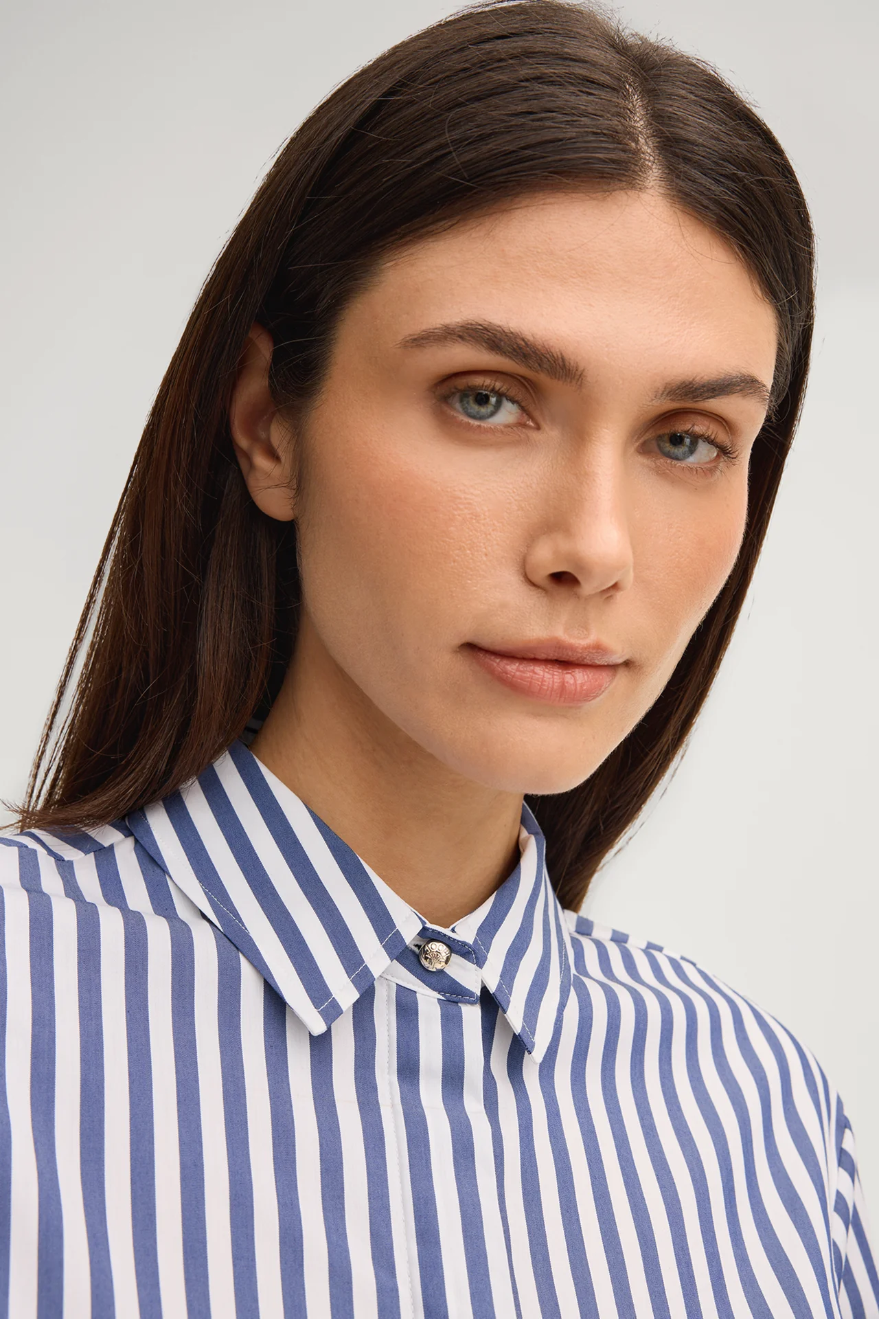 Smart zu leichten Sommerhosen, Jeans-Shorts oder Baumwollröcken, die locker geschnittene Hemdbluse Bette überzeugt durch ein modernes Design und stilvolle Details. Die Optik betonen der klassische Kragen mit Signé-Knopf, eine verdeckte Knopfleiste sowie die aufgesetzte Tasche. Feine Streifen machen das Piece zum Eyecatcher.