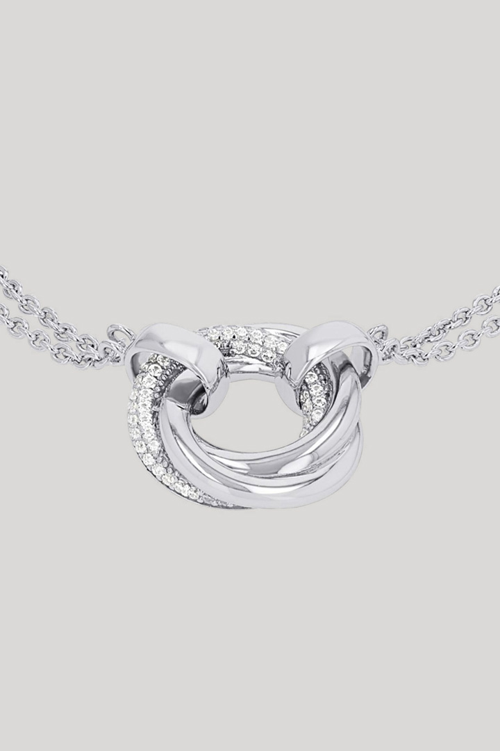 Elegant und raffiniert zu jedem Look erweist sich das filigrane Armband aus rhodiniertem 925er Silber mit rundem Zirkonia-Anhänger in verschlungener Ringoptik – ein Highlight im Set mit der dazugehörigen Halskette. Für ein vereinfachtes An- und Ablegen des Schmuckstücks sorgt ein Karabinerverschluss, ikonisch akzentuiert durch ein Signé-Label.