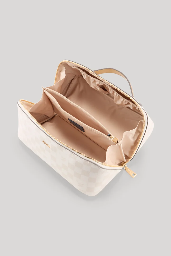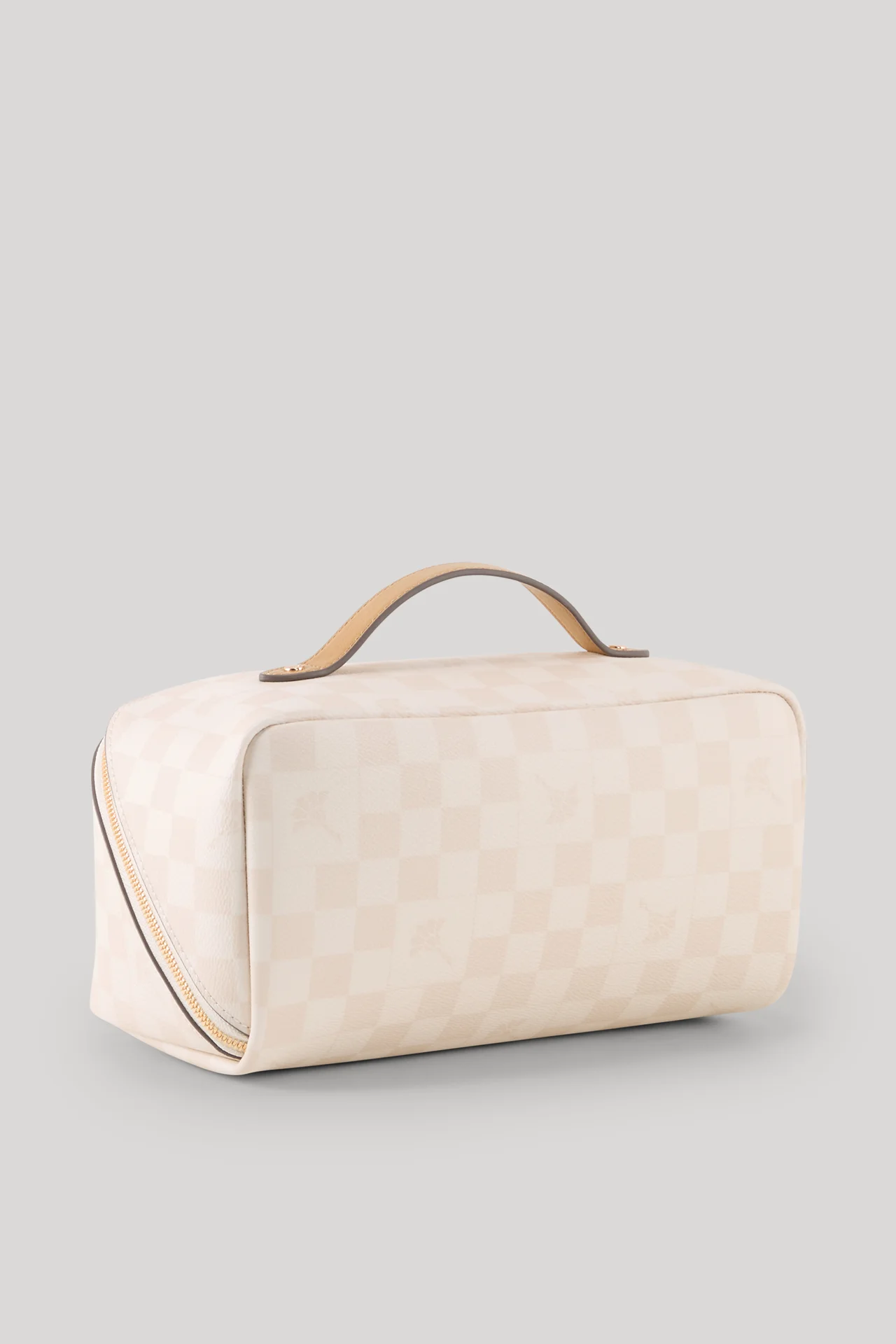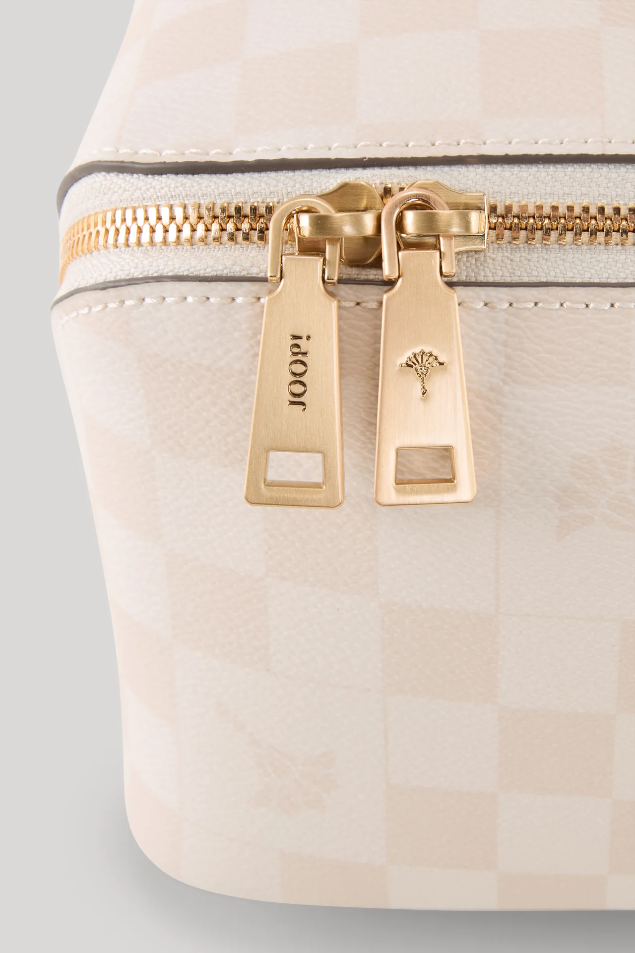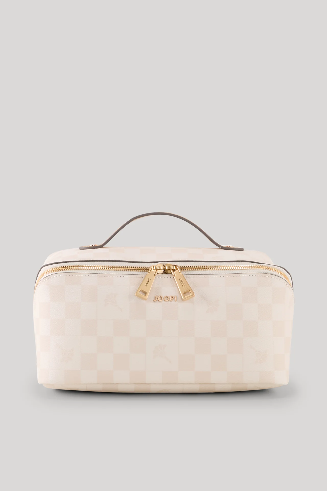 Das Beauty-Case Cortina Zea zeichnet sich durch Kunstleder im ikonischen Schachbrett-Design mit Cornflowers aus. Ein kurzer Tragehenkel und das zippbare Inlay mit Innenfächern ergänzen das Accessoire. Für das akzentuierte Finish sorgt das metallisierte Label-Relief.