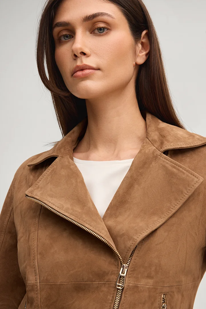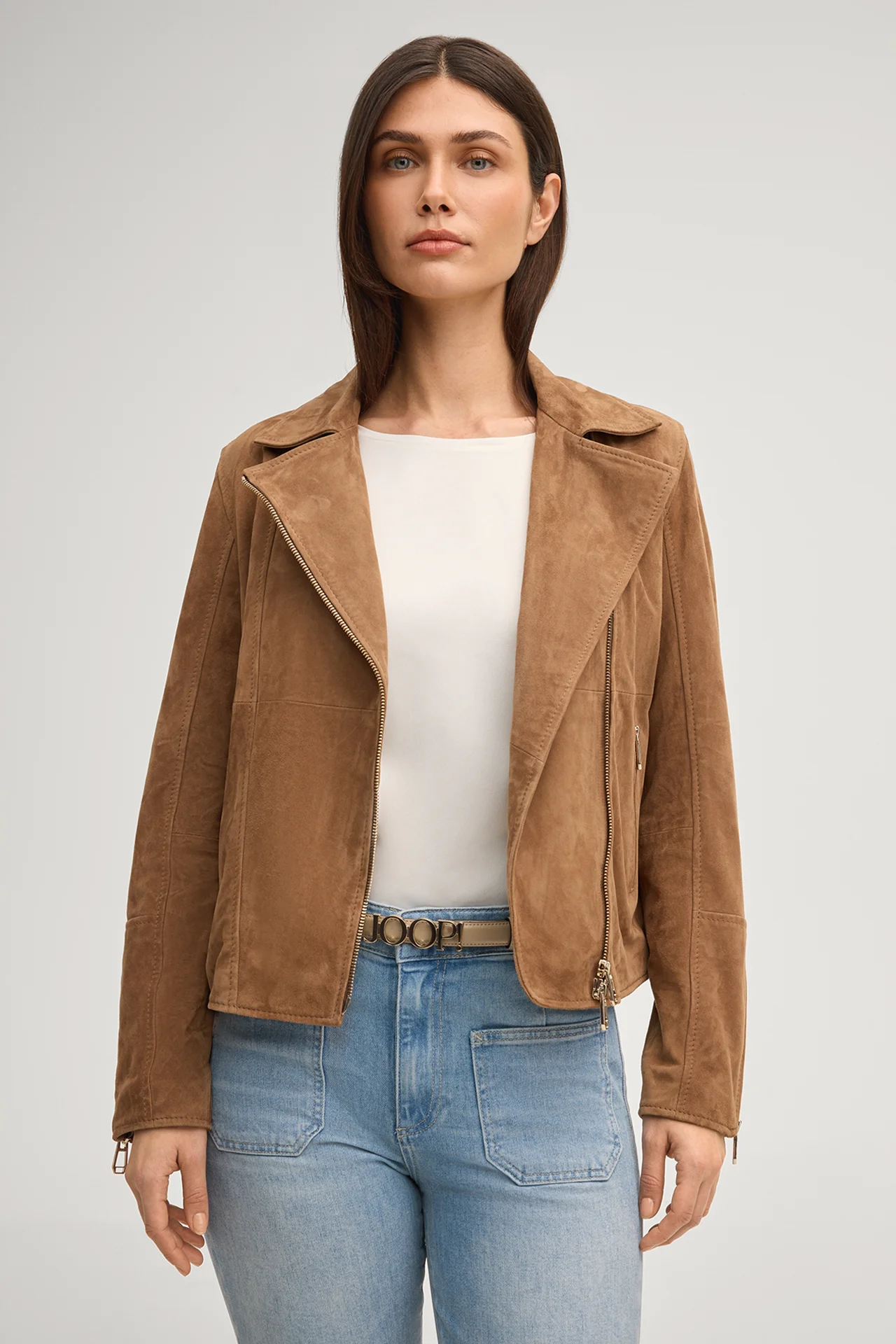 Lässige Details wie der asymmetrische Zwei-Wege-Zipper und justierbare Ärmelabschlüsse zeichnen den charakteristischen Look der Lederjacke im Bikerstil aus. Für die elegante Optik sorgt extraweiches Ziegenveloursleder, abgerundet durch feine Teilungsnähte und das Futter im Logo-Print. Der Umlegekragen schenkt ein klassisches Finish. Die Jacke wirkt in vielseitiger Kombination und ist ein zeitloser Favorit.