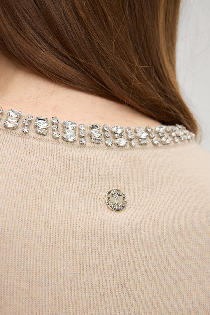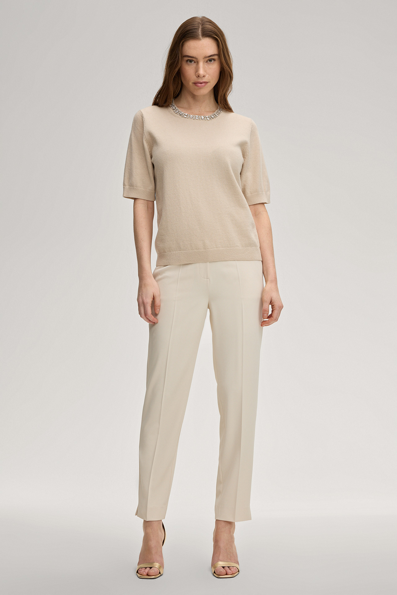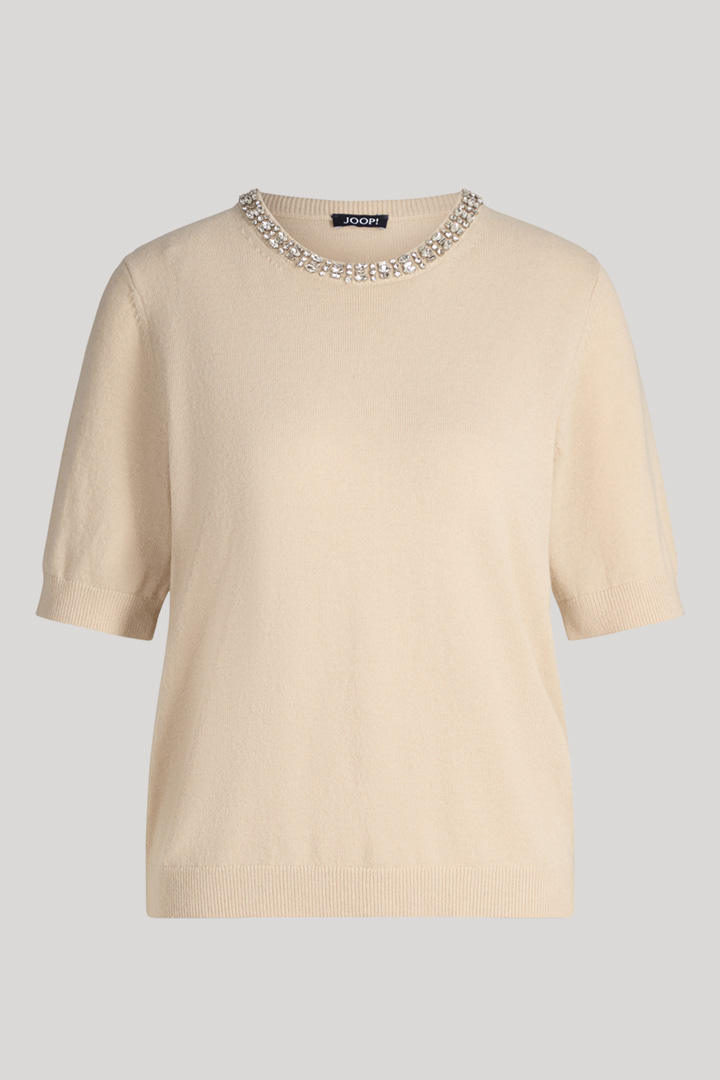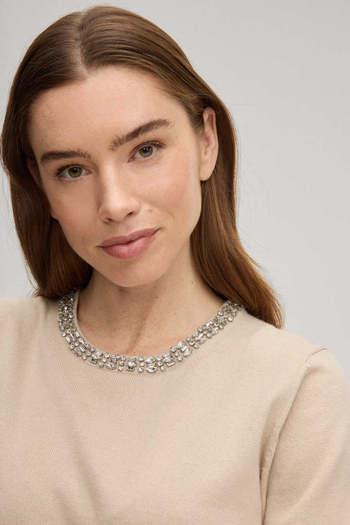 Mit luxuriösem Twist begeistert der Pullover Krissi aus Wollmischung mit Cashmere. Für den Eyecatcher Look sorgen applizierte Kristallsteine am Ausschnitt. Kurze Ärmel und gerippte Bündchenabschlüsse ergänzen die feminine Optik. Der Allrounder passt zu vielseitigen Outfits von klassisch bis chic.