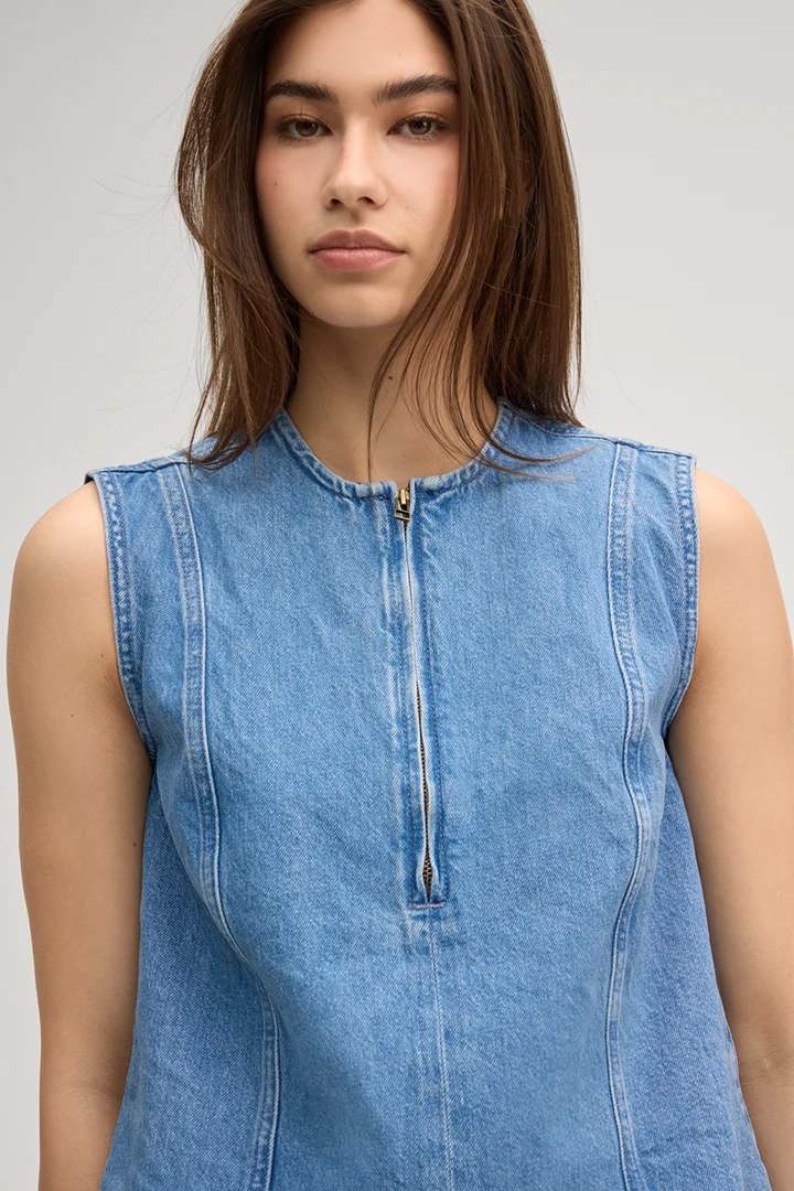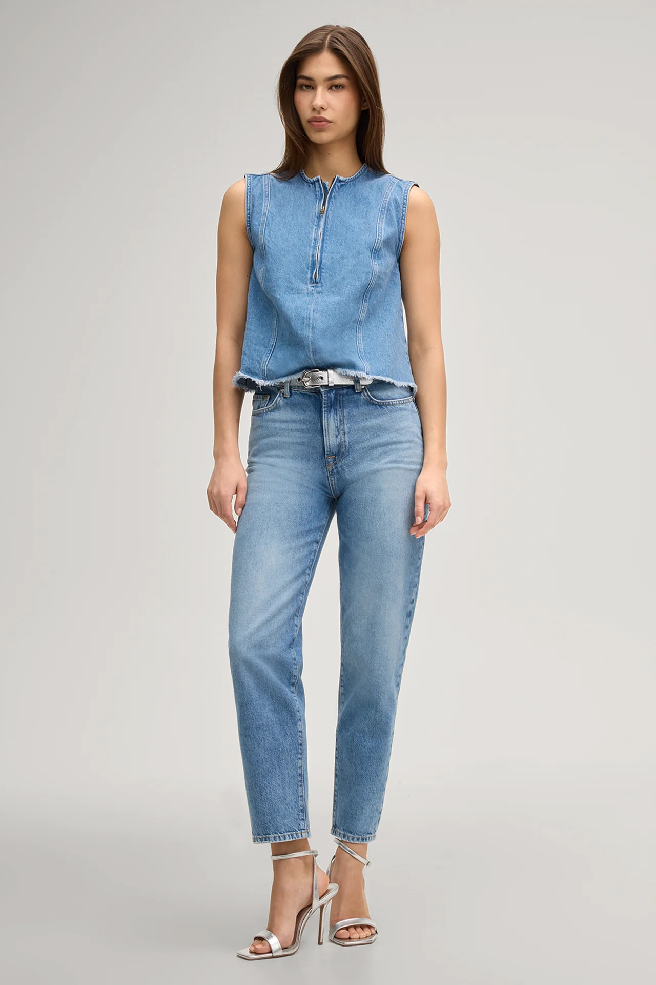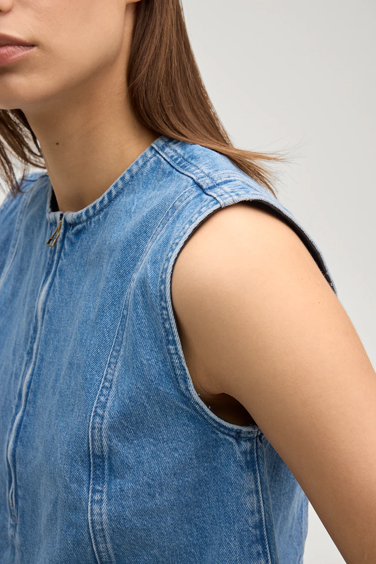 Stylishes Denim-Retro-Flair versprüht das Jeans-Top Ute aus leichtem Baumwolldenim. Den raffinierten Look definieren der verdeckte Zipper, moderne Nahtdetails sowie die ausgestellte Silhouette mit offenem Saum. Ob als Complete Style zu langen oder kurzen Jeans, feminin zu Jeansröcken oder als Sommeroutfit mit Shorts, das Piece ist ein selbstbewusster Eyecatcher.