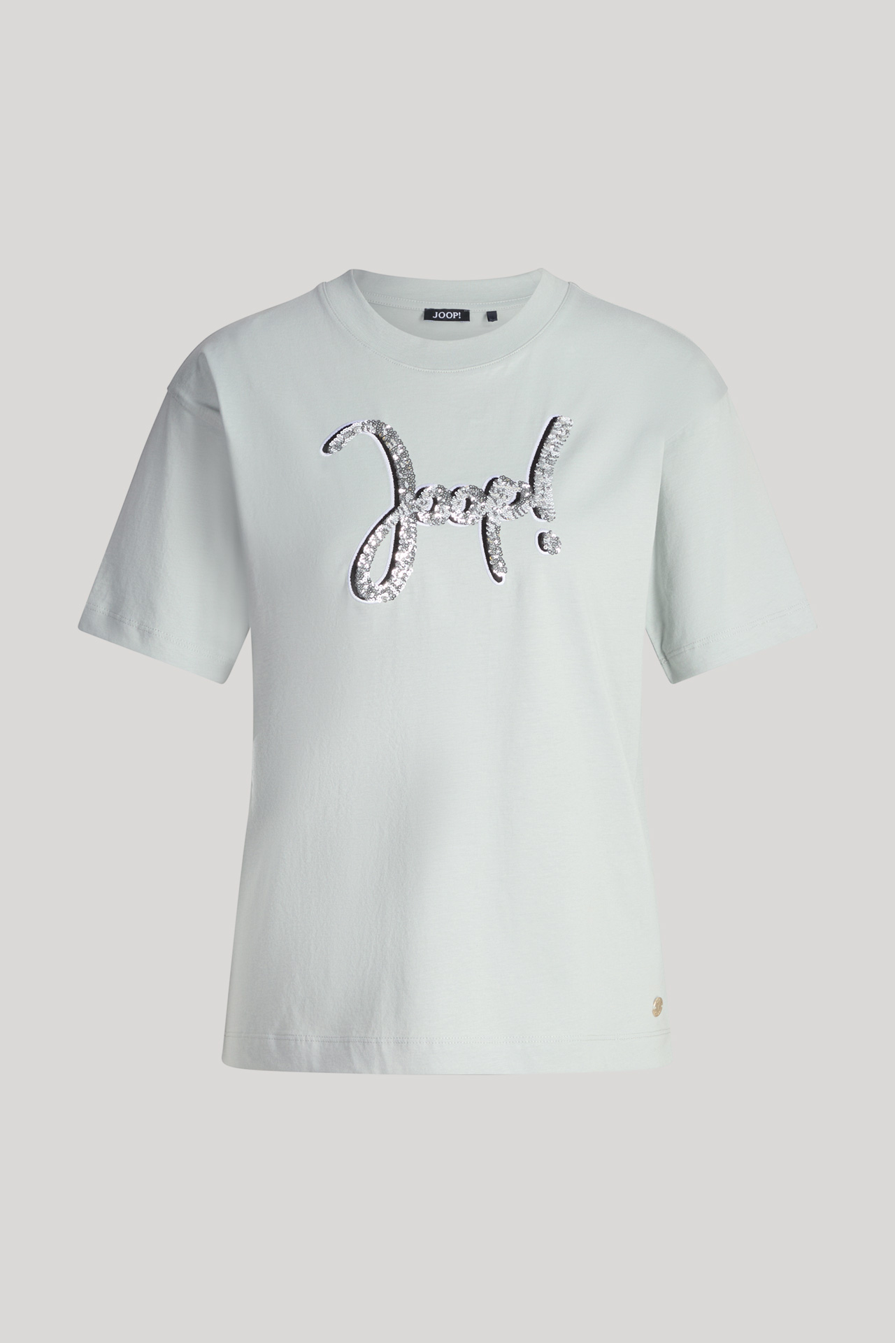 Als Statement Piece erweist sich das T-Shirt Toraya mit Logo-Schriftzug im Glitzer-Design. Der Look erhält durch den Rundhalsausschnitt und doppelt vernähte Bündchen ein stilvolles Finish, ergänzt durch die Signé-Plakette.