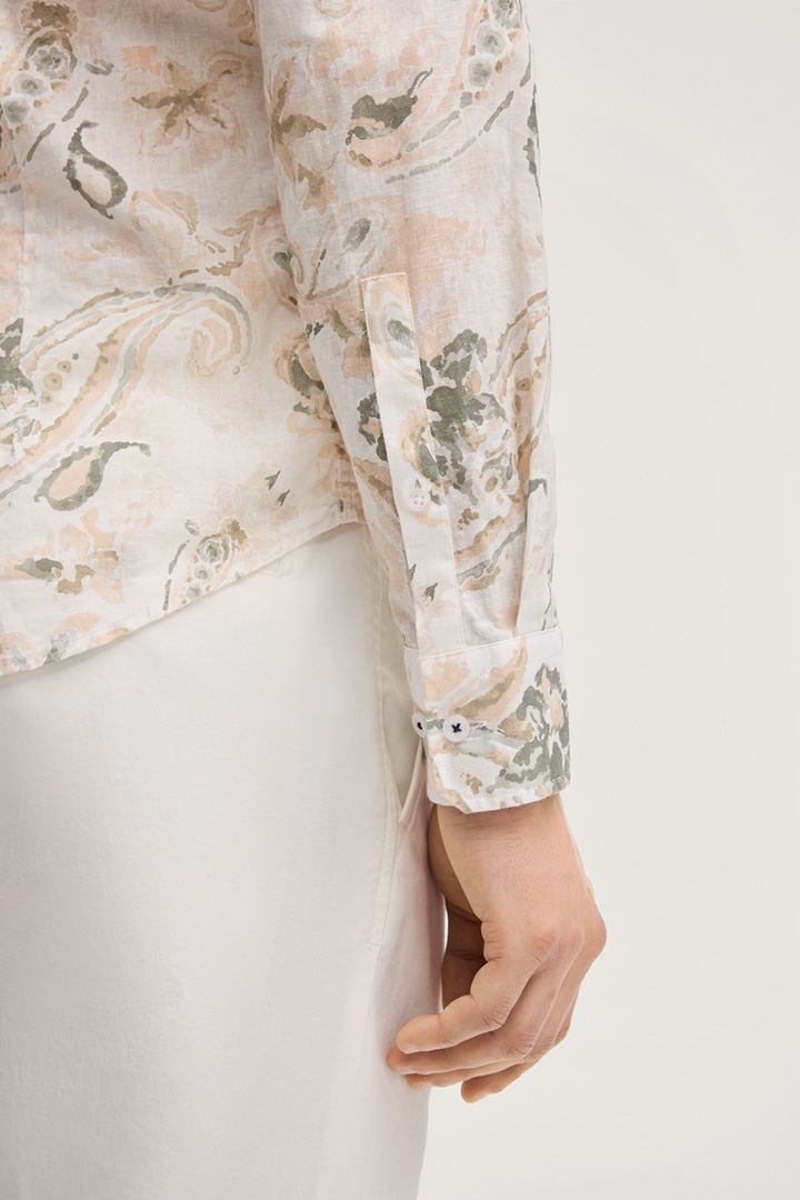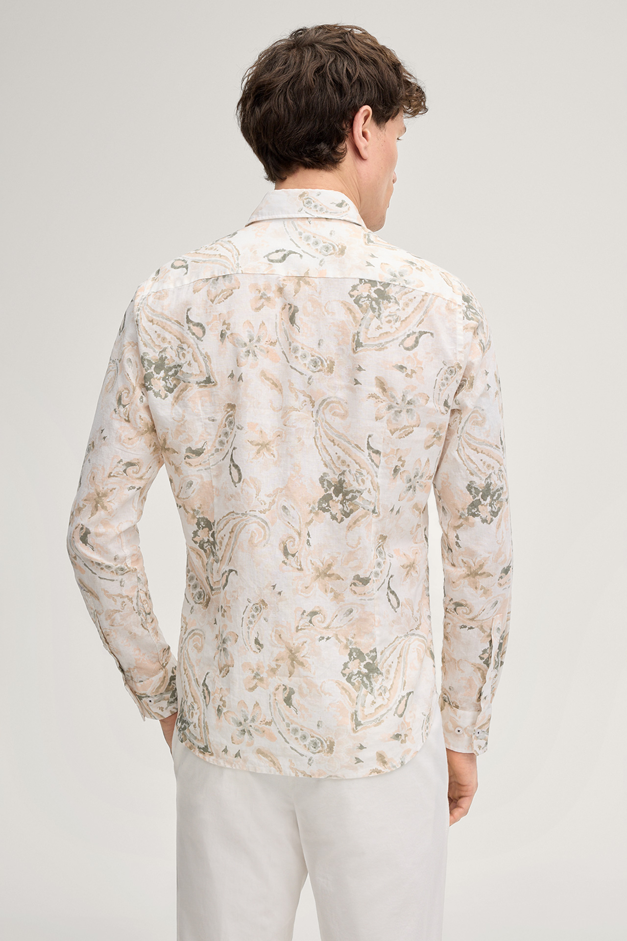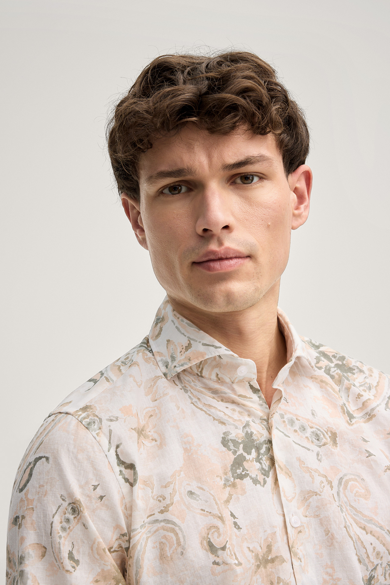 Mit dem klassischen Cutaway-Kragen und langen Ärmeln mit Dachschlitz und knöpfbaren Manschetten präsentiert sich das Hemd Pai als stilvoller Dresscode. Für den modernen Charakter sorgt der Paisley-Print. Sommerlichen Komfort bietet die Verarbeitung aus Leinen mit Baumwolle.