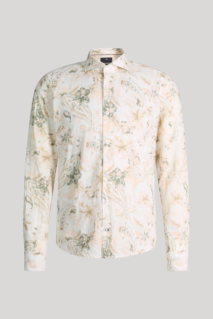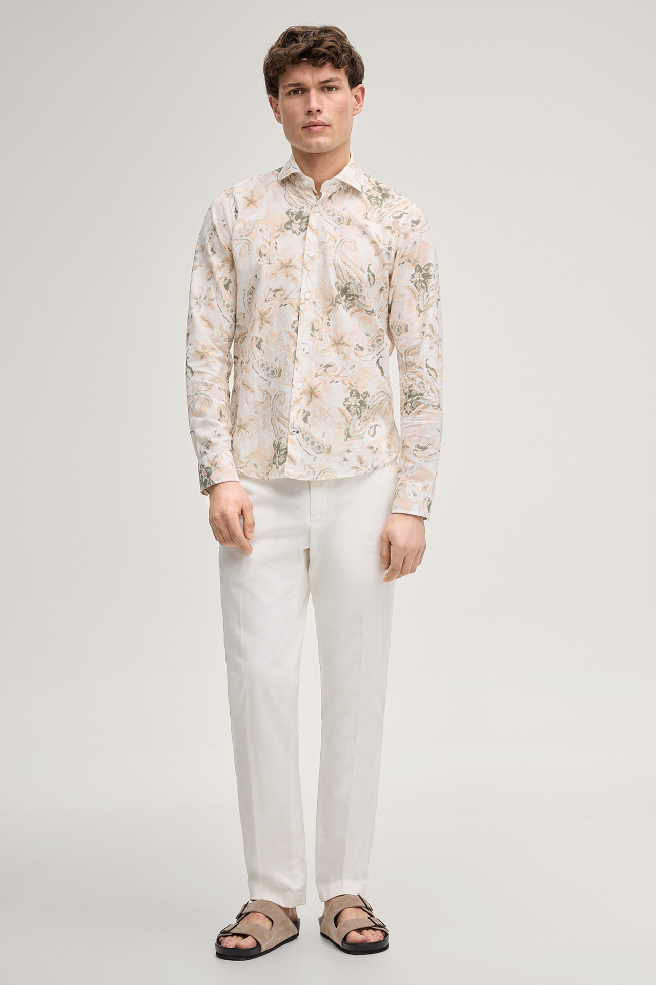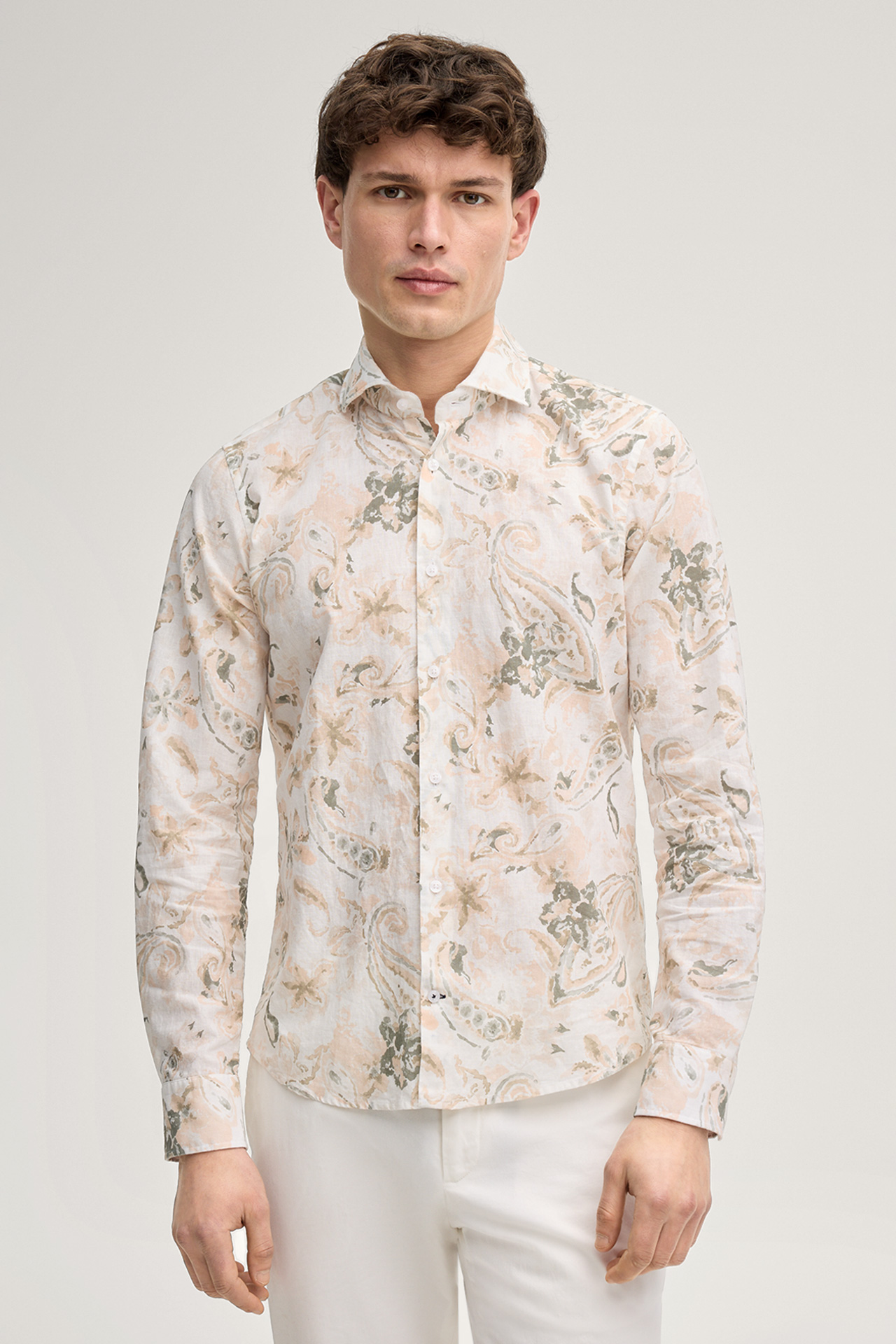 Mit dem klassischen Cutaway-Kragen und langen Ärmeln mit Dachschlitz und knöpfbaren Manschetten präsentiert sich das Hemd Pai als stilvoller Dresscode. Für den modernen Charakter sorgt der Paisley-Print. Sommerlichen Komfort bietet die Verarbeitung aus Leinen mit Baumwolle.