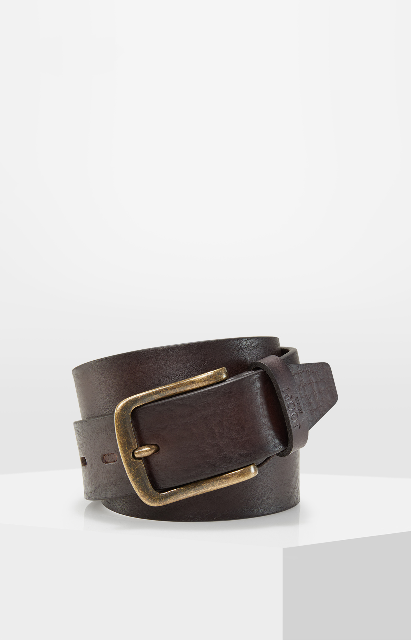 Der dunkelbraune JOOP! JEANS Gürtel aus luxuriösem Rindnappaleder überzeugt in Vintage-Optik mit feiner Narbenstruktur und einer angenehm glatten Haptik. Die Dornschließe aus gebürstetem Metall in Schwarzgold betont den markanten Look, ergänzt durch einen Logo-Schriftzug auf der Lederschlaufe. Mit selbstverständlicher Extravaganz verleiht das Accessoire jedem Style eine smarte Note.