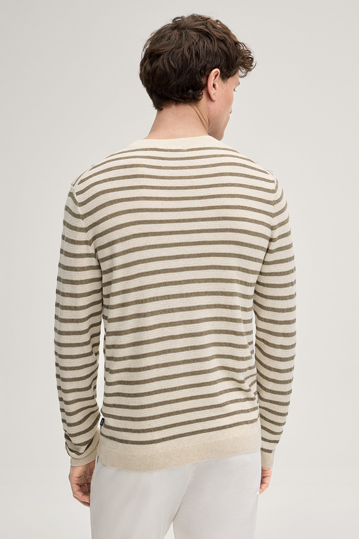 Als Allrounder und stilvoller Favorit für sommerliche Outfits präsentiert sich der Pullover Malior. Das feine Streifenmuster harmoniert mit der leichten Qualität aus Leinenmischung und schenkt dem Piece die moderne Note. Charakteristische Details runden das Design ab, akzentuiert durch lange Ärmel, gerippte Bündchen und den Rundhalsausschnitt.