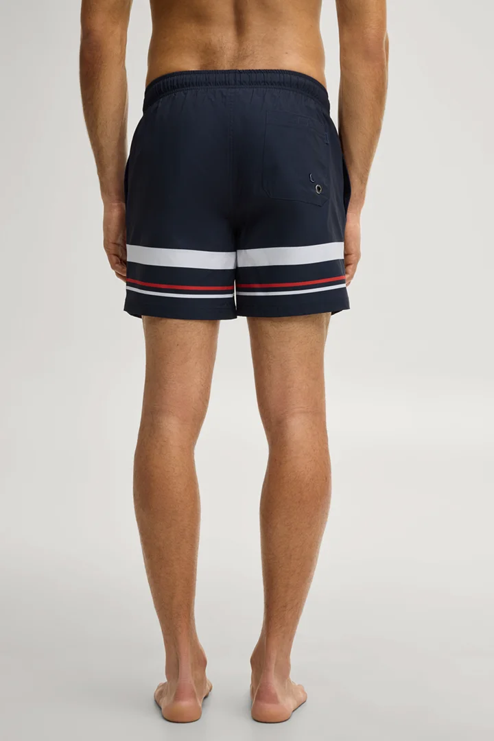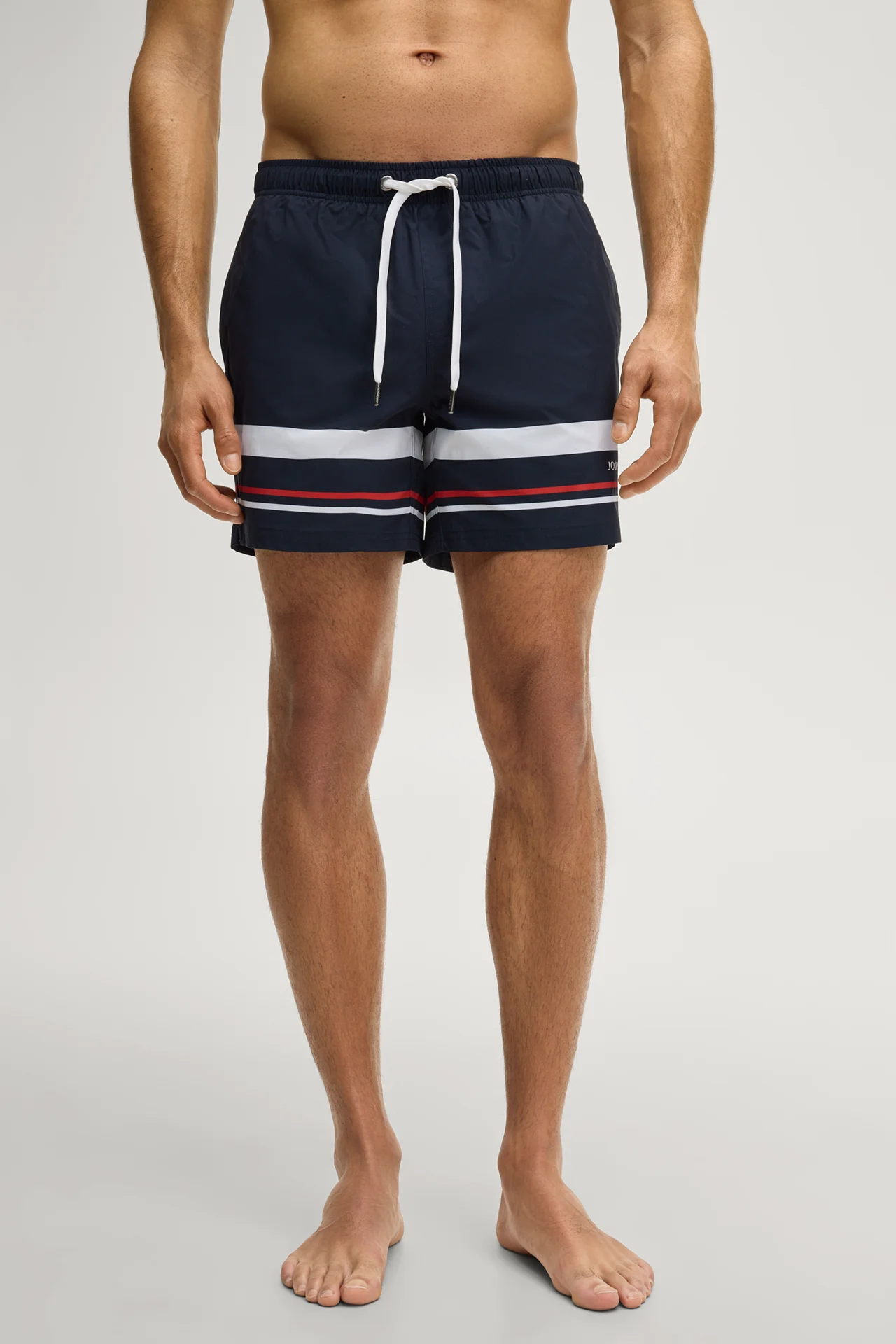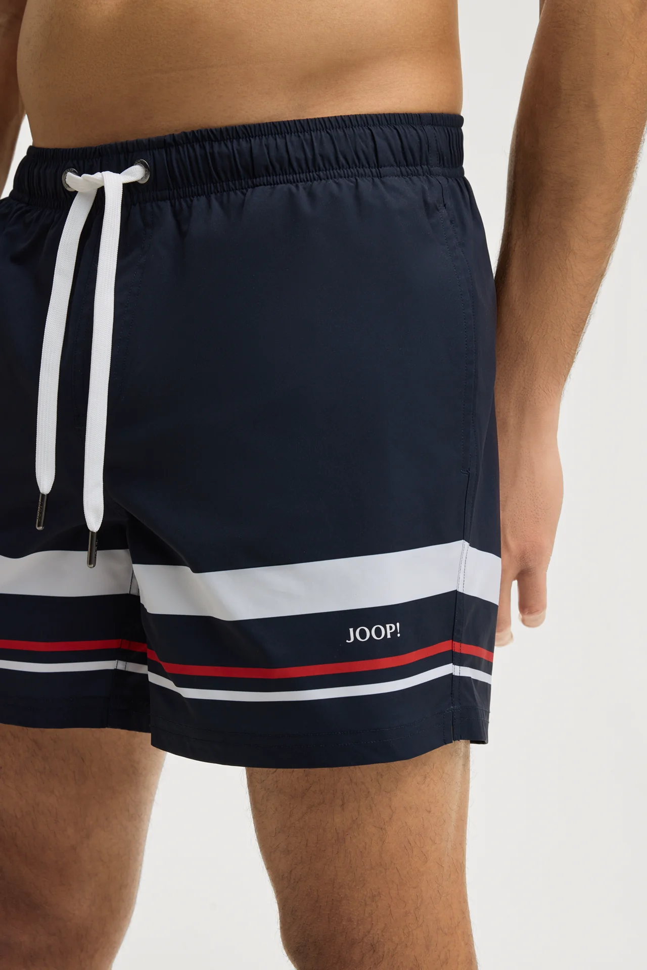 Moderne Streifen-Prints verleihen der Badehose einen modernen Look, ikonisch ergänzt durch den dezenten Logo-Schriftzug. Details wie die aufgesetzte Gesäßtasche und der angedeutete Zipper sorgen für den klassischen Twist. Tragekomfort an entspannten Tagen am Strand oder beim Wassersport bieten der elastische Bund mit Tunnelzug sowie die Tech-Qualität mit leichter Innenhose aus Mesh.