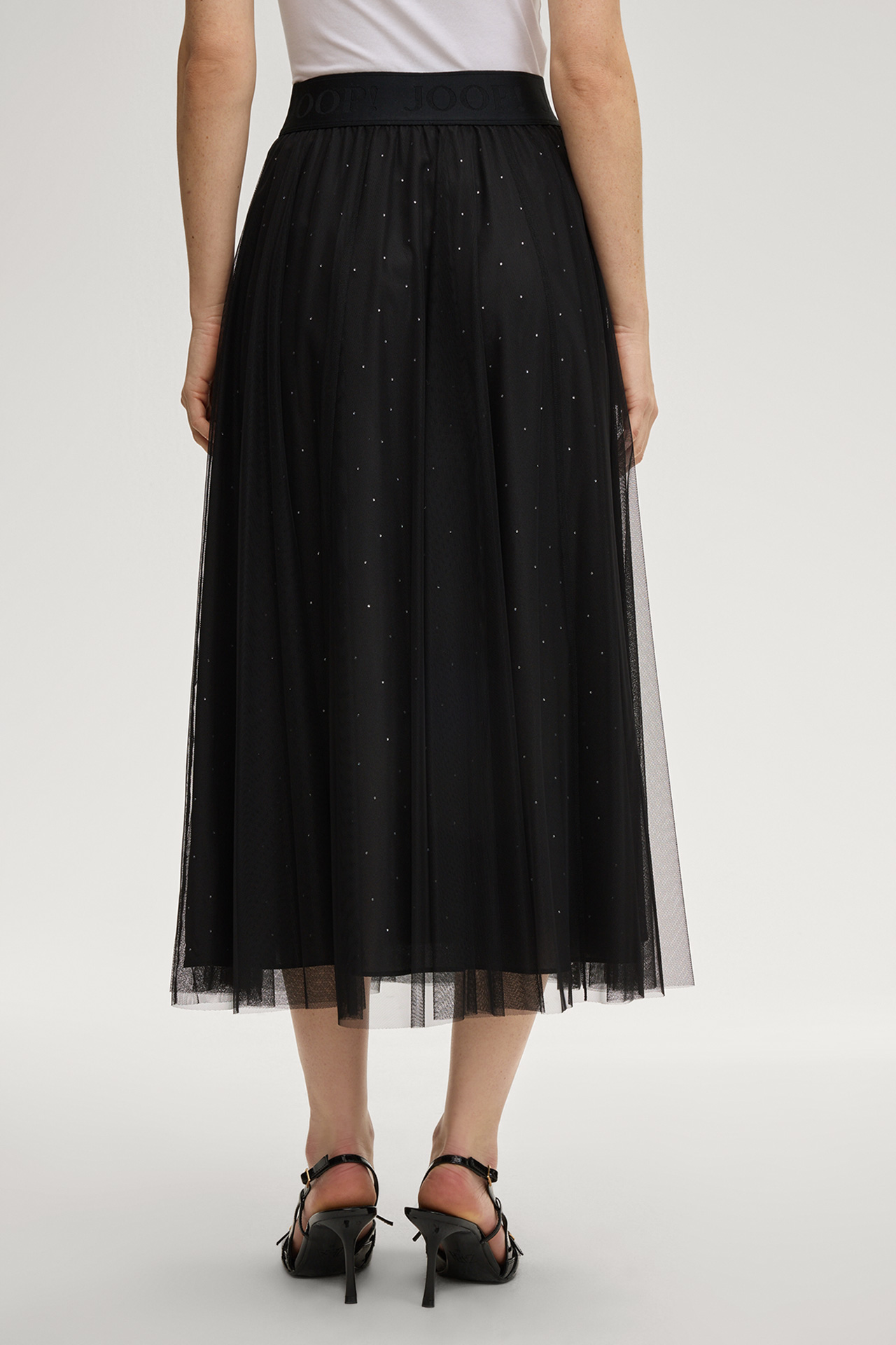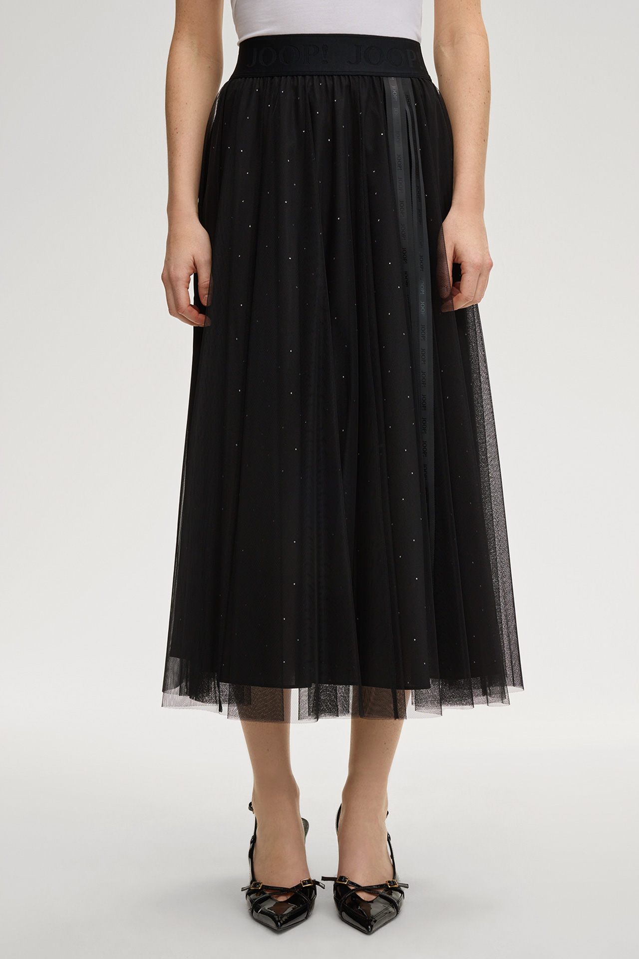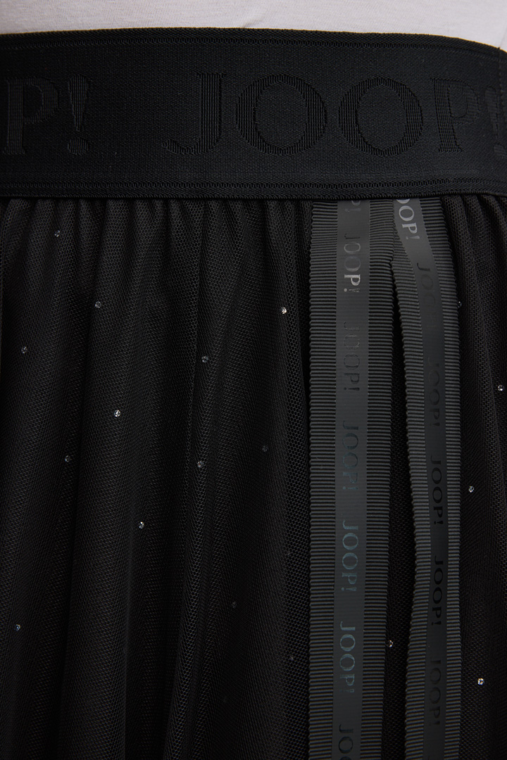 Layering-Tüll und ein blickdichtes Futter im monochromen Design zeichnen den femininen A-Linien-Rock Frida aus. Für einen ikonischen Eyecatcher sorgt das dekorative Logo-Ripsband, komfortabel ergänzt durch den elastischen Jacquard-Bund – ein variables Item für moderne Looks mit stilvollem Flair.