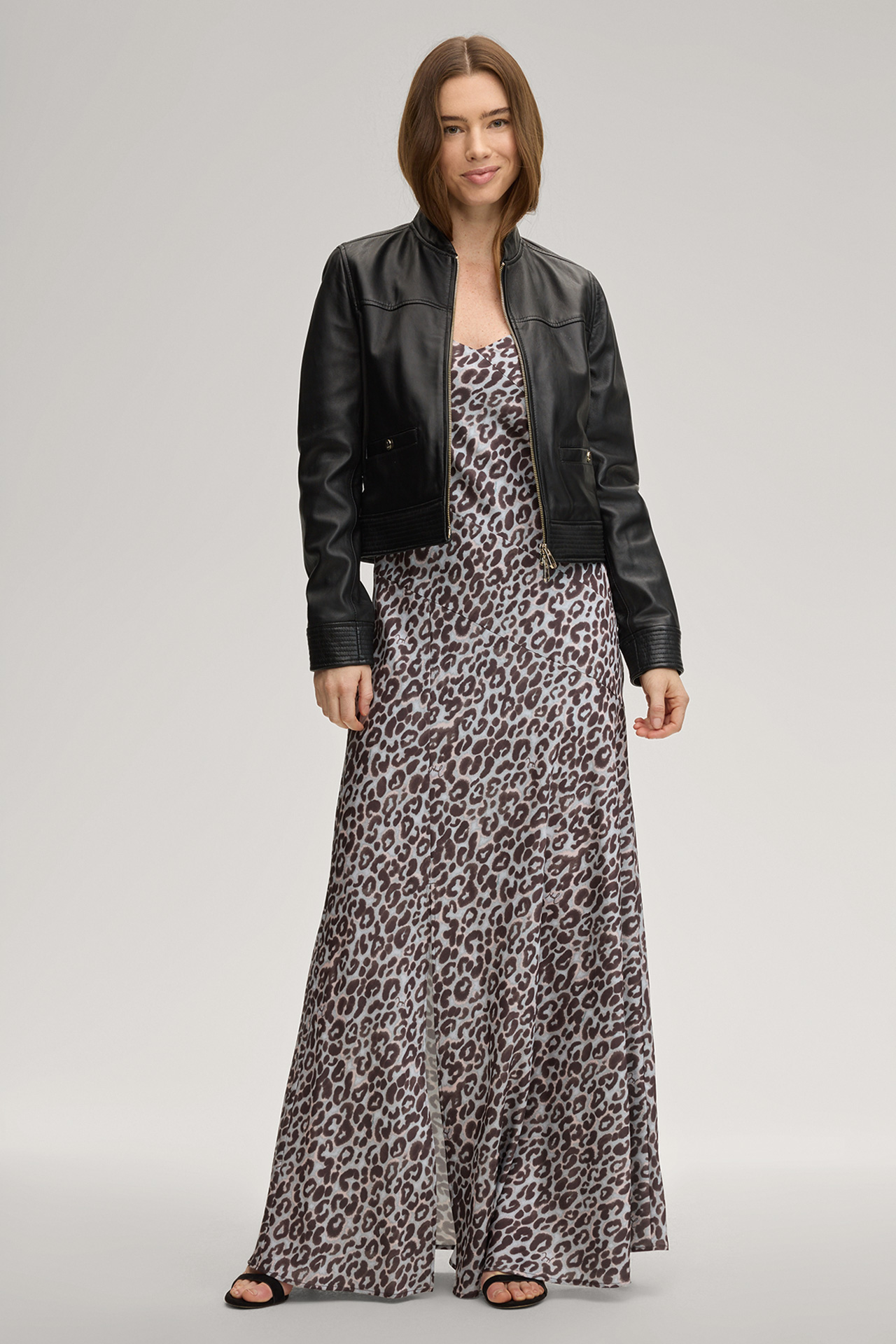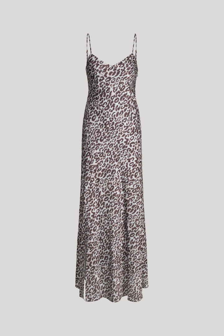 Als Trendlook begeistert das feminine Satinkleid Delci im Leo-Animalprint und in figurbetonter Silhouette. Justierbare Spaghettiträger und der vorderseitige Schlitz verleihen zusätzliche Akzente, ergänzt durch feine Logo-Details. Das Kleid verfügt über einen nahtverdeckten Zip-Verschluss – elegant für besondere Anlässe und lässig in Kombination mit Boots und Lederjacke.