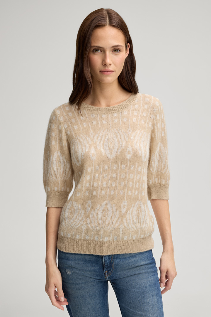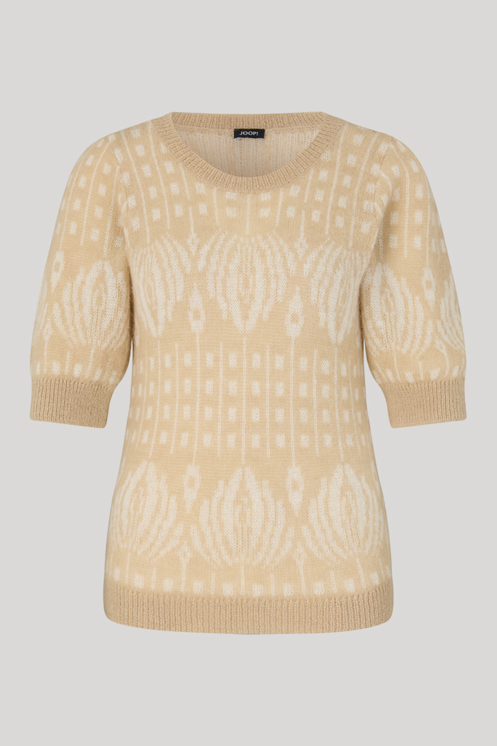 Im Mix mit Alpaka und Wolle überzeugt der Strickpullover Kathe als komfortables Piece, ergänzt durch das moderne Jacquard-Design. Den Style heben der klassische Rundhalsausschnitt sowie gerippte Bündchen hervor, während die Labelplakette für einen signaturetypischen Akzent sorgt.