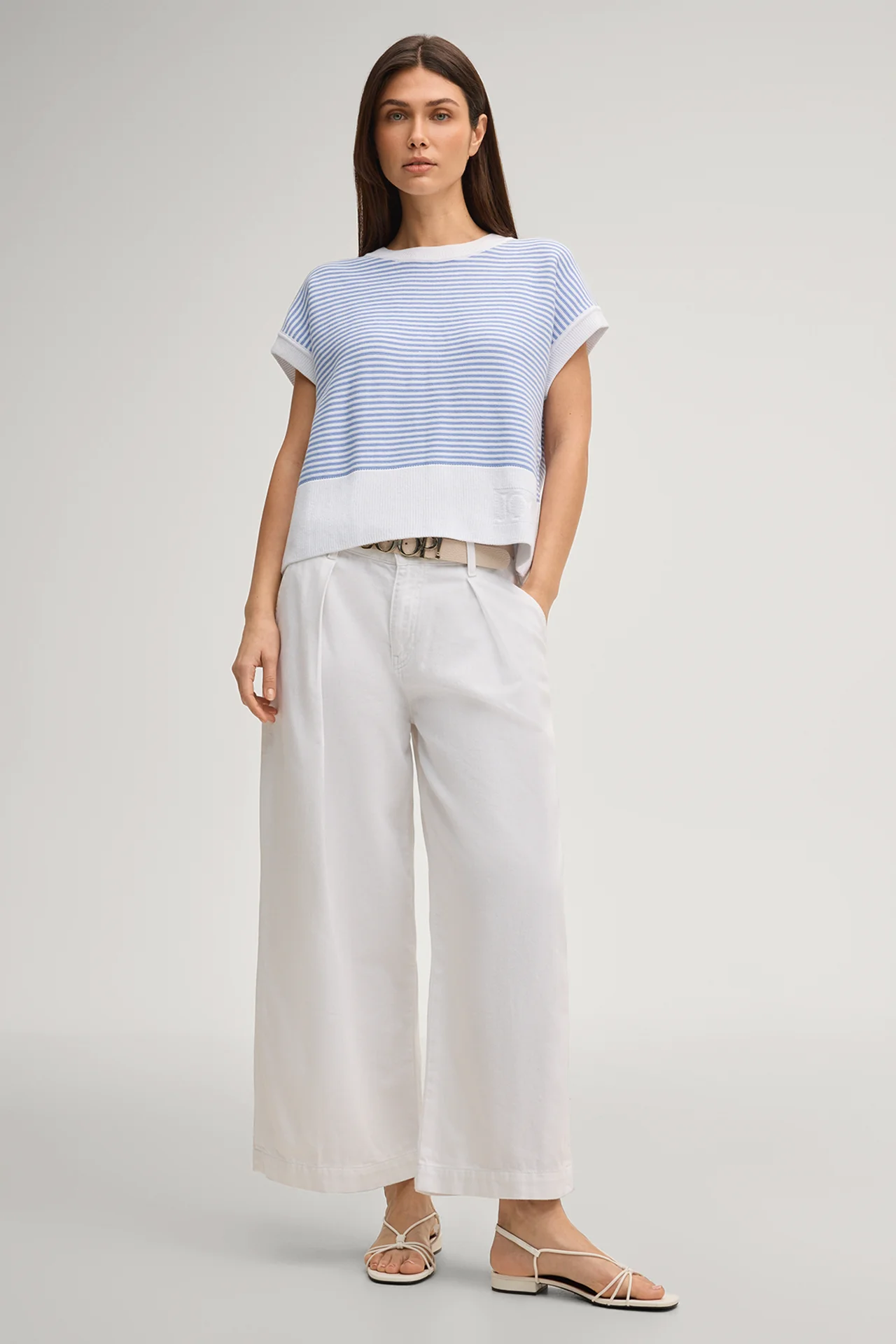 Im kurzärmeligen Design mit feinen Streifen, modern abgesetzten Rippstrickbündchen und einem tonal geprägtem Logo-Schriftzug am Saum erweist sich das feminine Strickshirt Kipe als kombinationsstarkes Highlight. Überschnittene Schultern prägen die stilvolle Silhouette. Für puren Tragekomfort sorgt die Verarbeitung aus reiner Bio-Baumwolle.