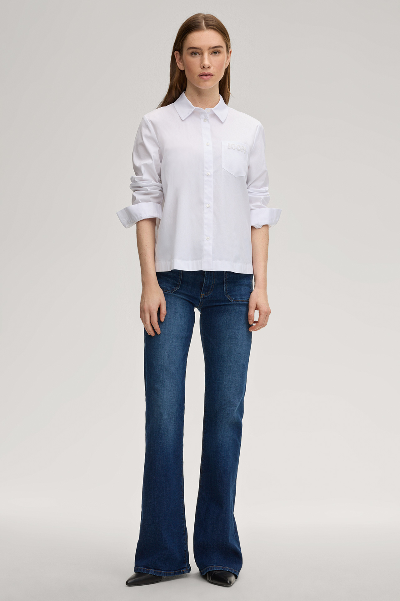 The decorative logo lettering on the breast pocket and a box pleat at the back lend a sophisticated twist to the Bella blouse. The shirt-style collar, full-length button placket, and buttoned cuffs add classic accents. This piece boasts a comfortable cotton blend.