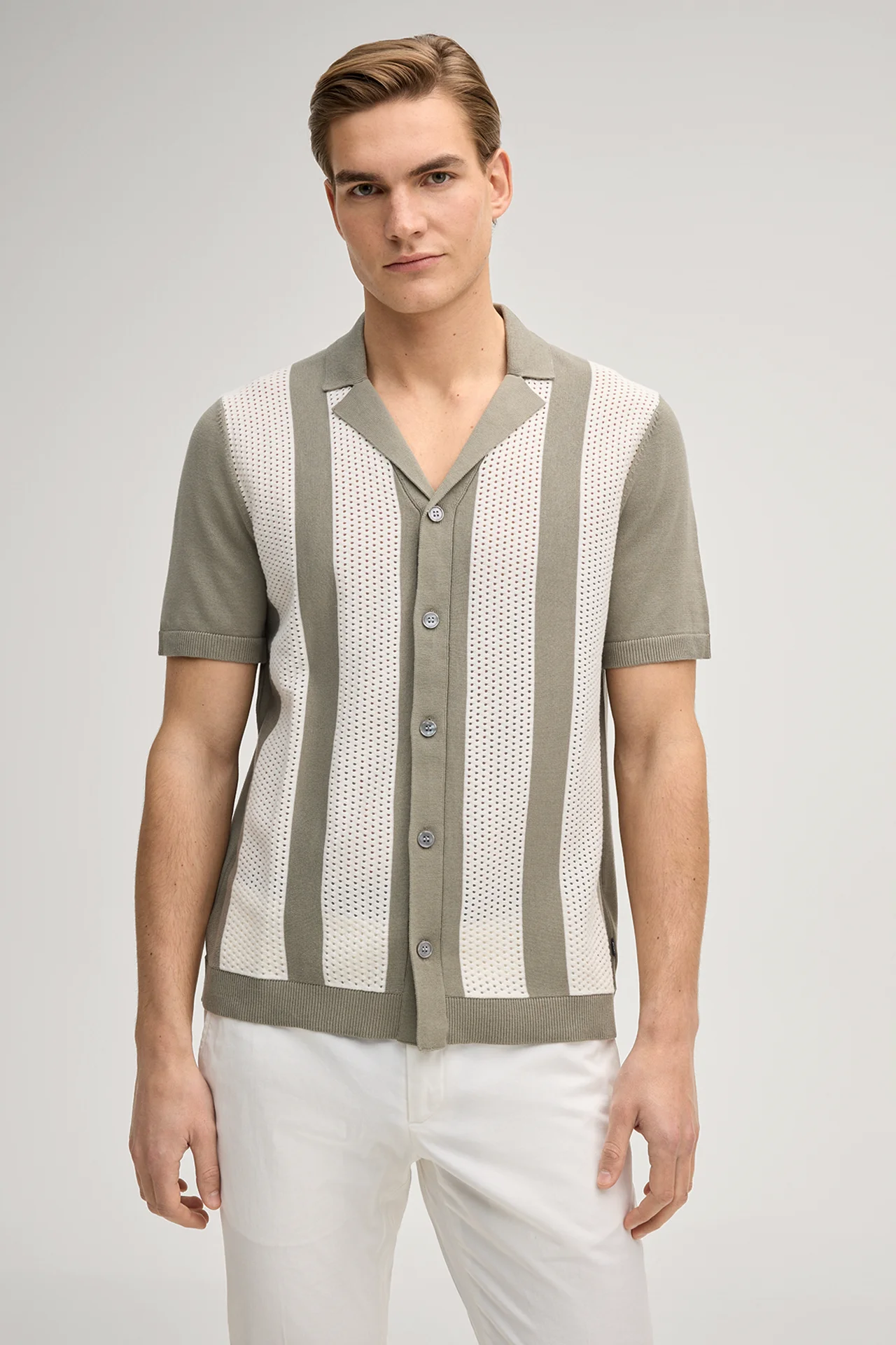The Galvo shirt is characterized by its sophisticated mix of harmonious stripes and perforated knit. Stylish elements such as the lapel collar and full-length button placket add a smart twist. Elasticated ribbed cuffs round off the piece. The cotton fabric ensures summery ease.