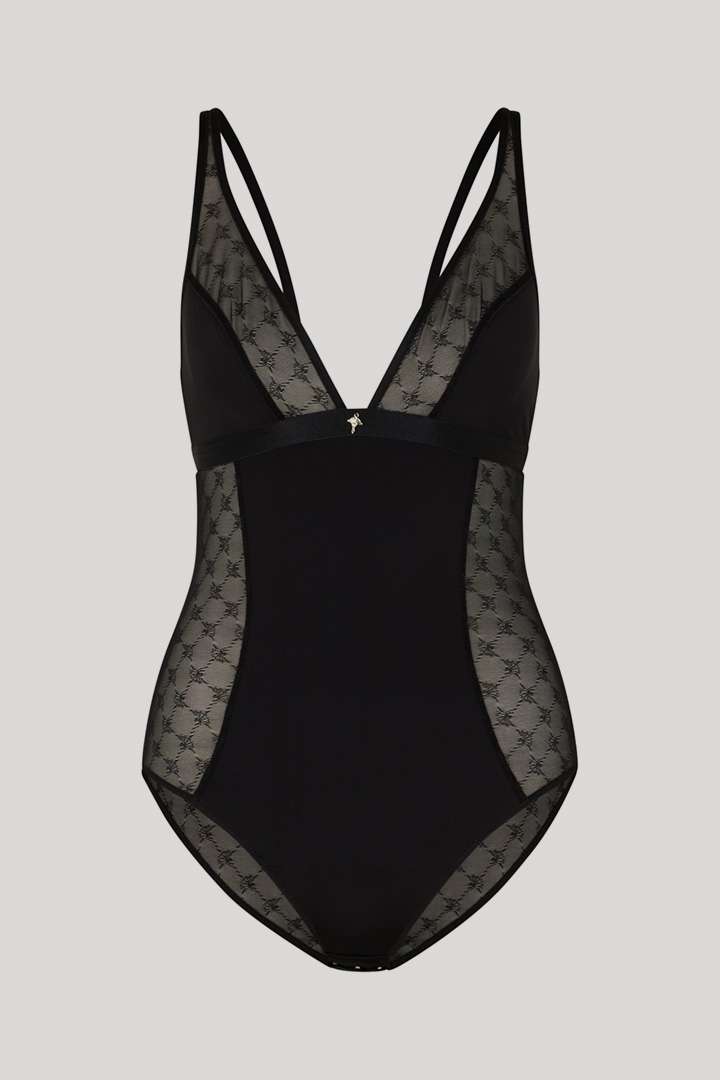 A lingerie highlight and a key style under a blazer - combine with the latest denims from the collection: the bodysuit in a plain-coloured design features sophisticated mesh lace in an iconic logo style. The modern style mix, a feminine neckline section with a signé pendant and the adjustable straps distinguish this special piece. From the Elegance Lingerie Collection.