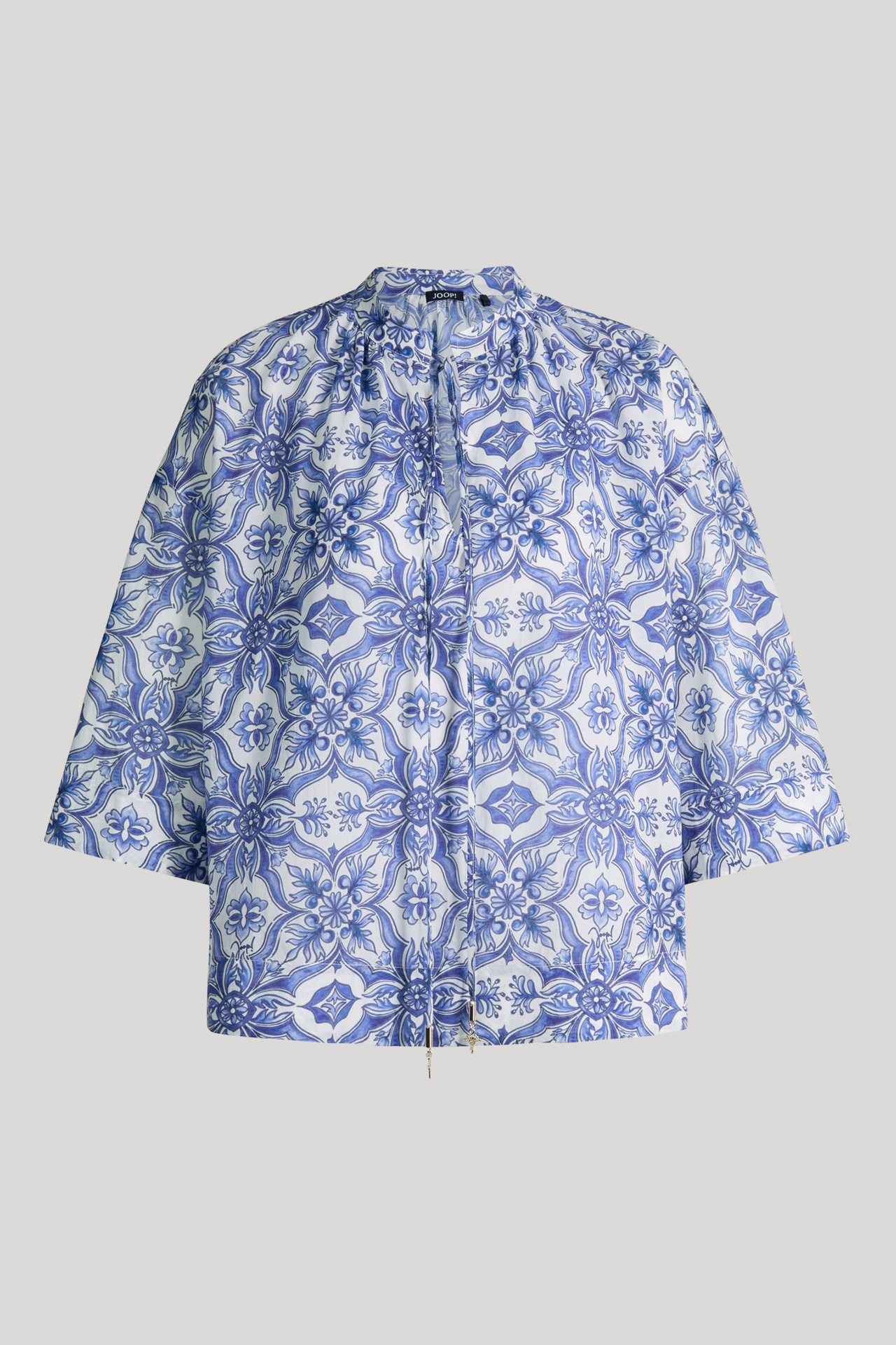The patterned print gives the Beyda blouse a sophisticated look, while the flowing cotton and silk fabric provides comfort. Three-quarter sleeves stress the modern design. The narrow stand-up collar with attached neckline and tie adds a subtle emphasis. This piece harmonises with the new jeans in the collection and looks great with marl trousers.