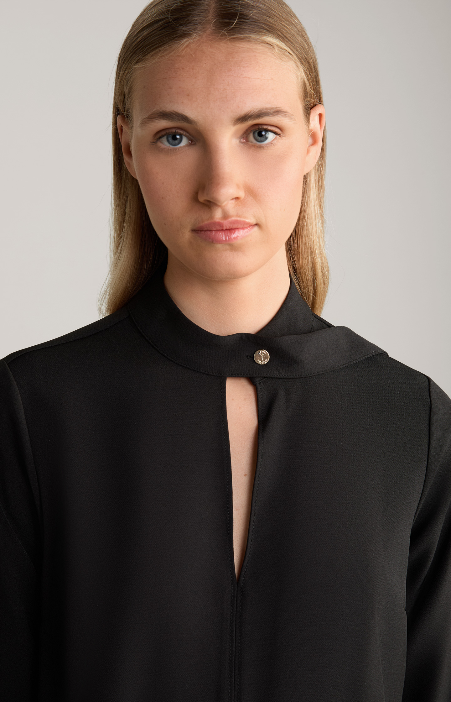 In a straight silhouette with a signé button on the stand-up collar and a tonal decorative band, this crêpe dress has great appeal as a key piece for any occasion, with the V-neck adding feminine accents. Side slit pockets complement the look.