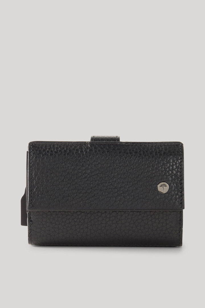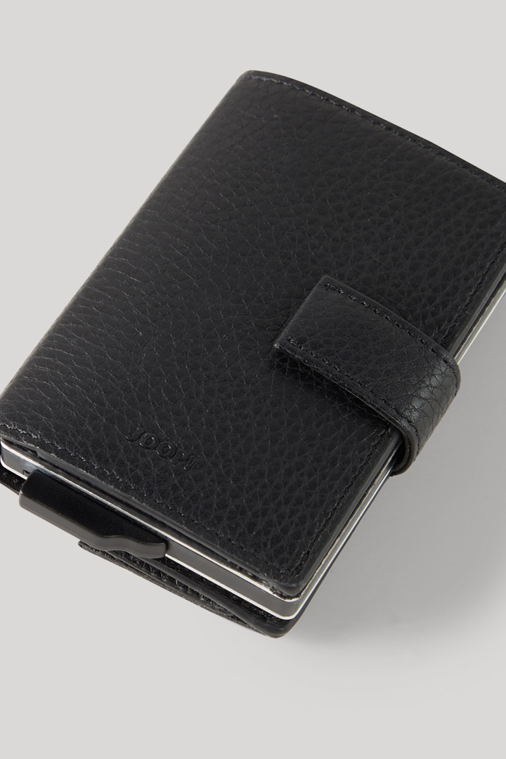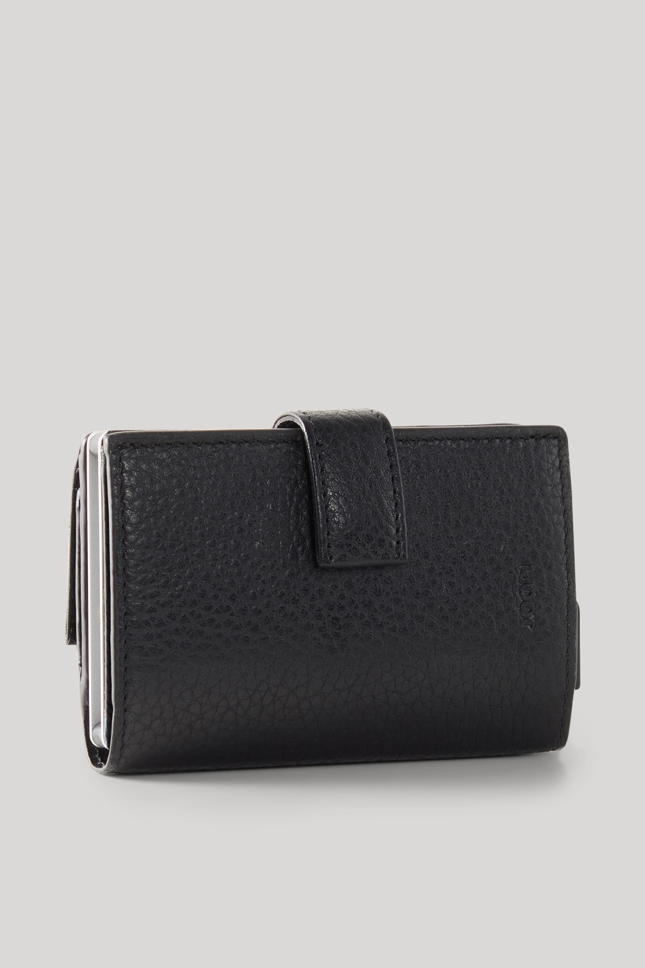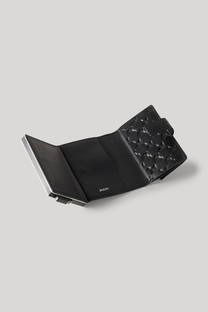 The thoughtful design of the fold-out JOOP! Cardona C-Three e-Cage wallet with integrated RFID safe system is key to the safekeeping of coins, banknotes and credit cards. It is made from genuine leather with a distinctive grain and a fastening strap. A functional accessory in a handy format – simply stowed away in your jacket or business bag.