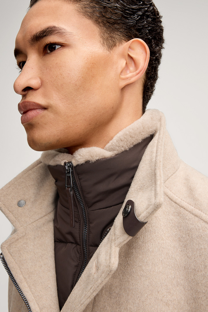 The Gary coat will win you over as a comfortable all-rounder, in a wool blend with a removable quilted inlay and complemented by a stand-up collar with teddy fur. The button placket and concealed zip duo, along with welt and flap pockets, create a stylish look. The slit at the back adds a harmonious finish to the piece.