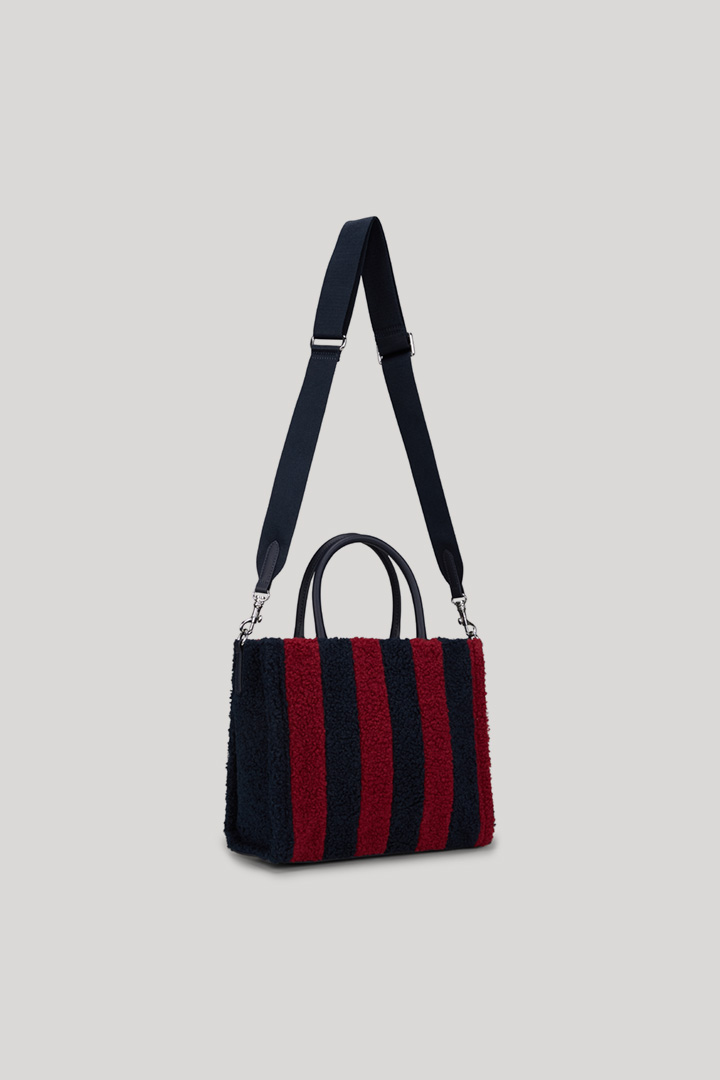 Thanks to its shearling look, stripes and front logo patch, the Squadra Aurelia handbag boasts an irresistible heritage style. The accessory features a convenient zip closure and the label's signature crossbody strap with carabiner. Available in two sizes.