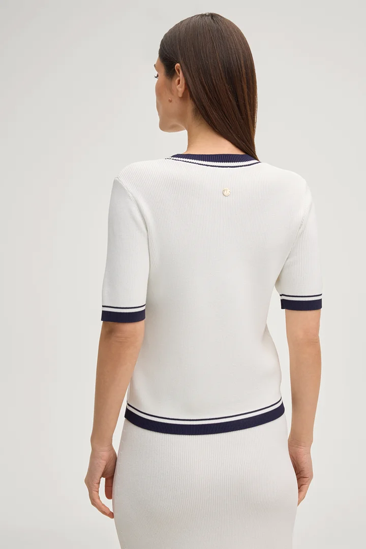 With its fine ribbed texture and contrasting striped details, the Kirela shirt has a look in style. This essential piece features a classical round neckline and modern half sleeves. The viscose blend provides easy comfort – a favourite with shorts, skirts and summer trousers.