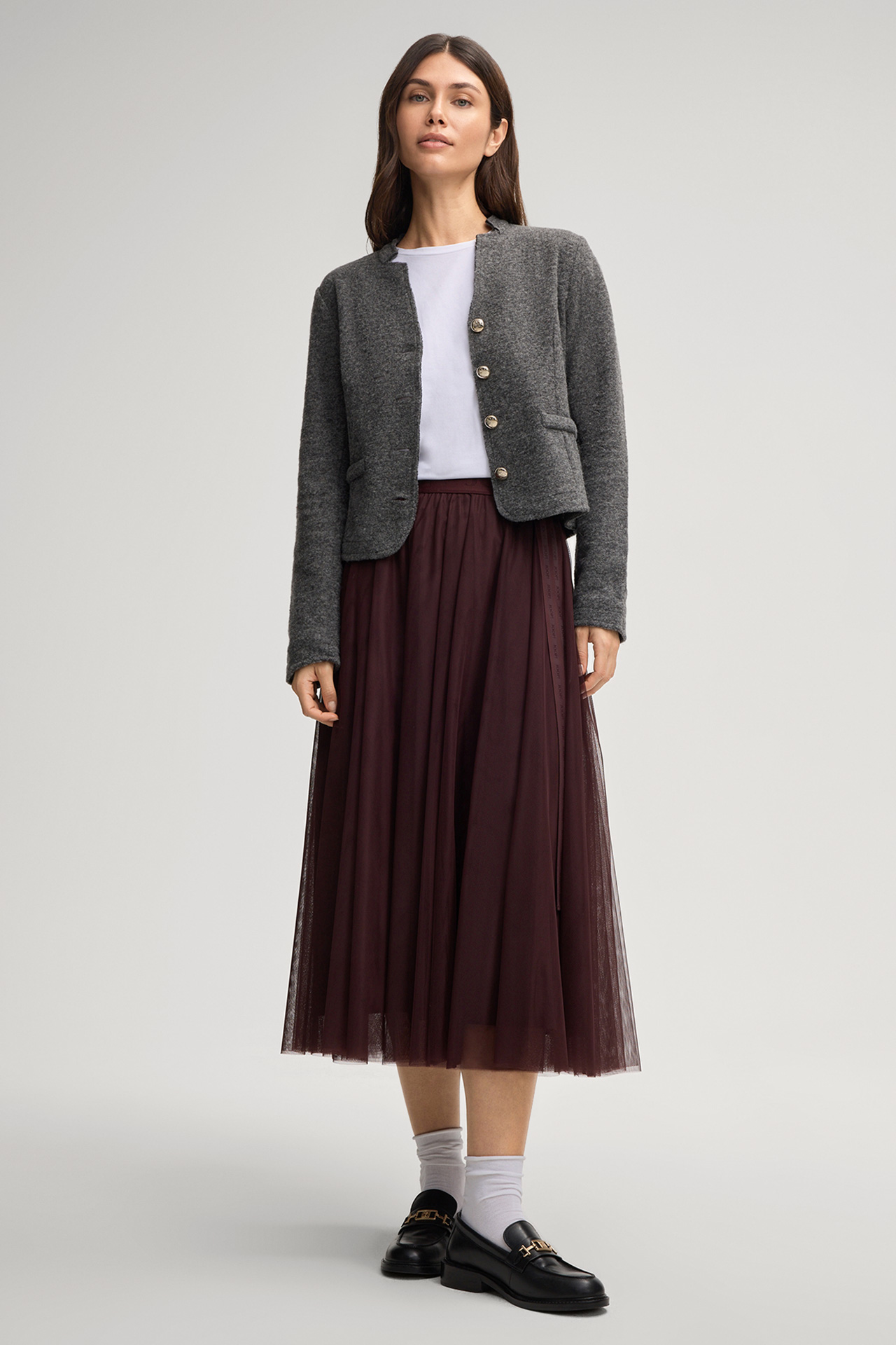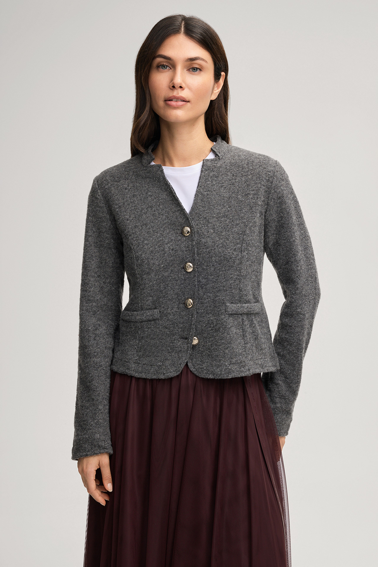 This piece is sure to impress as a knitted cardigan or lightweight jacket, thanks to its decorative buttons and the narrow stand-up collar with a sophisticated twist. Piped pockets and shaping seams add a harmonious finish to the feminine silhouette. in a wool blend.
