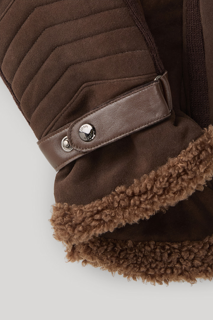 Featuring topstitching and a leather strap with press stud, these gloves stand out as casual pieces. The goatskin suede finish, complemented by details in teddy fur, ensures a luxurious upgrade.