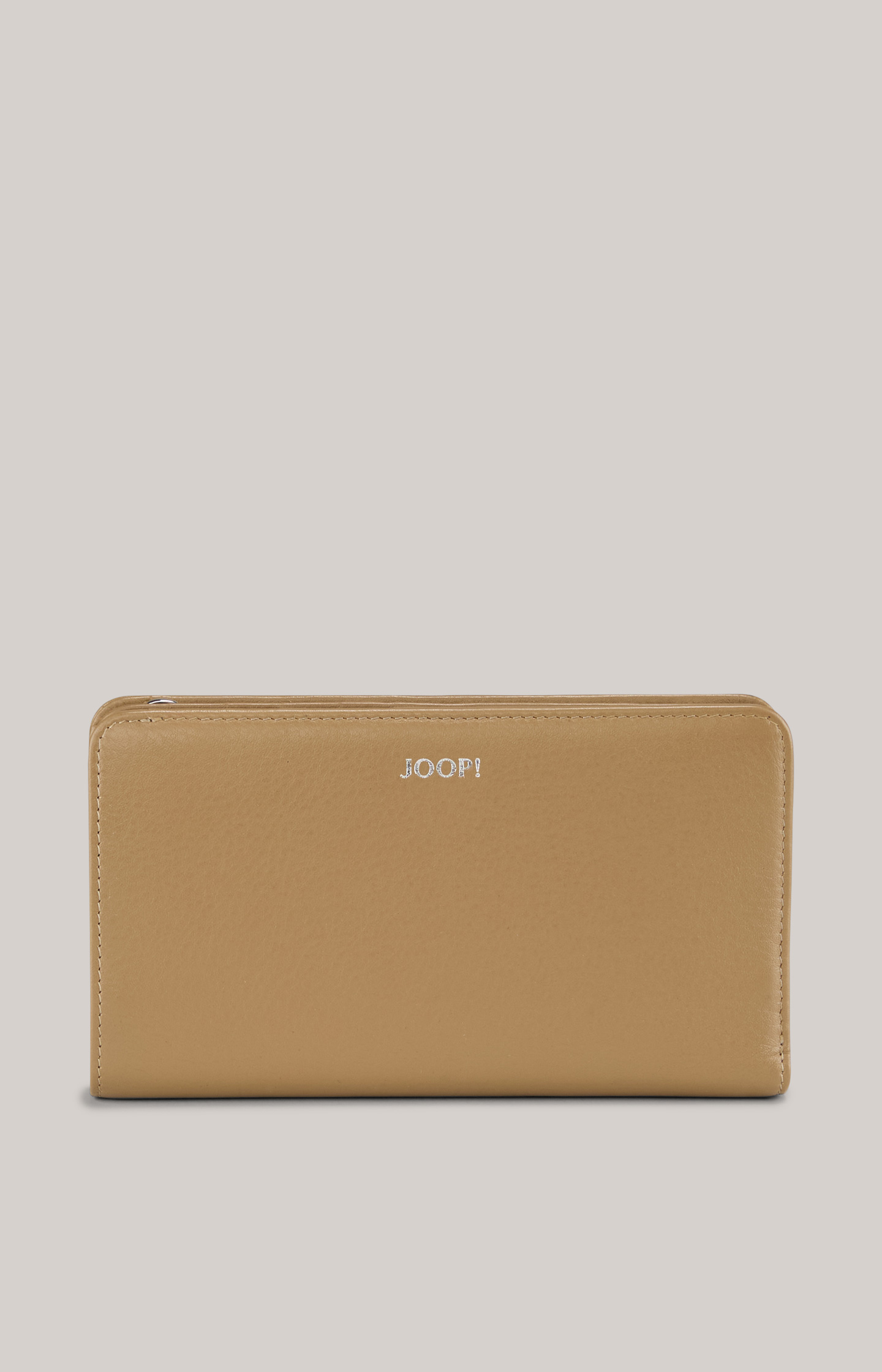 The Sofisticato Belinda wallet excels as a stylish accessory with fine logo details including the iridescent lettering on the front. The piece showcases a fine grained smooth leather quality and a smart interior layout with numerous compartments for notes, debit and credit cards, complemented by a separate zipped coin compartment for a practical finish.