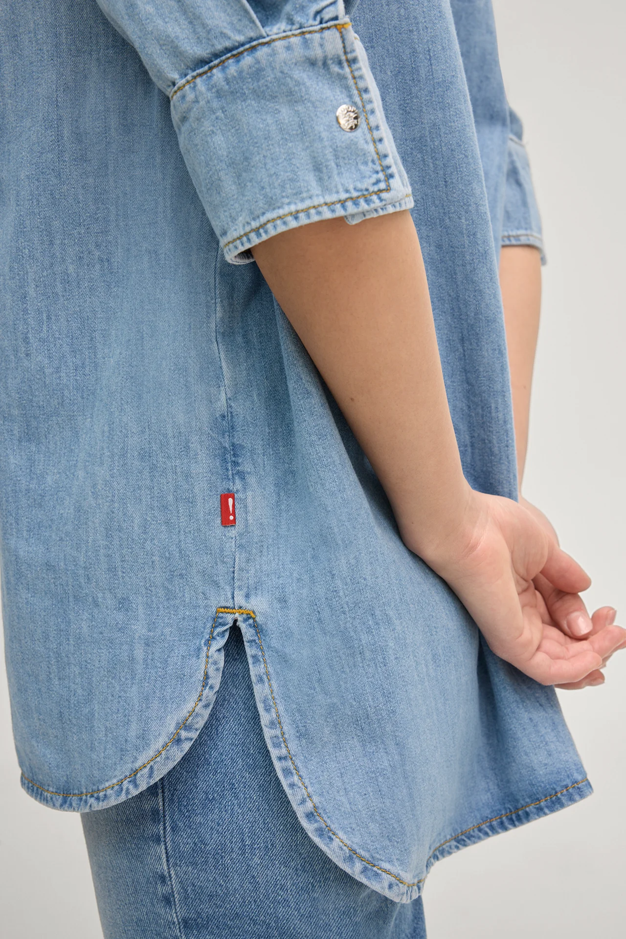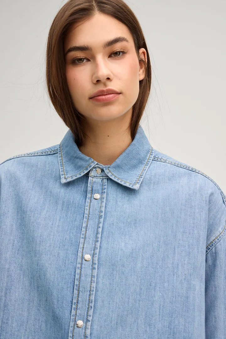 The Uma shirt blouse combines a classical look with pure casualness. Details such as the typical shirt collar and the button placket characterize the style, harmoniously completed by three-quarter sleeves with buttoned cuffs. The pure cotton denim fabric and the loose silhouette, which is best shown off in combination with the slim-fit trousers from the collection, give it a modern twist.