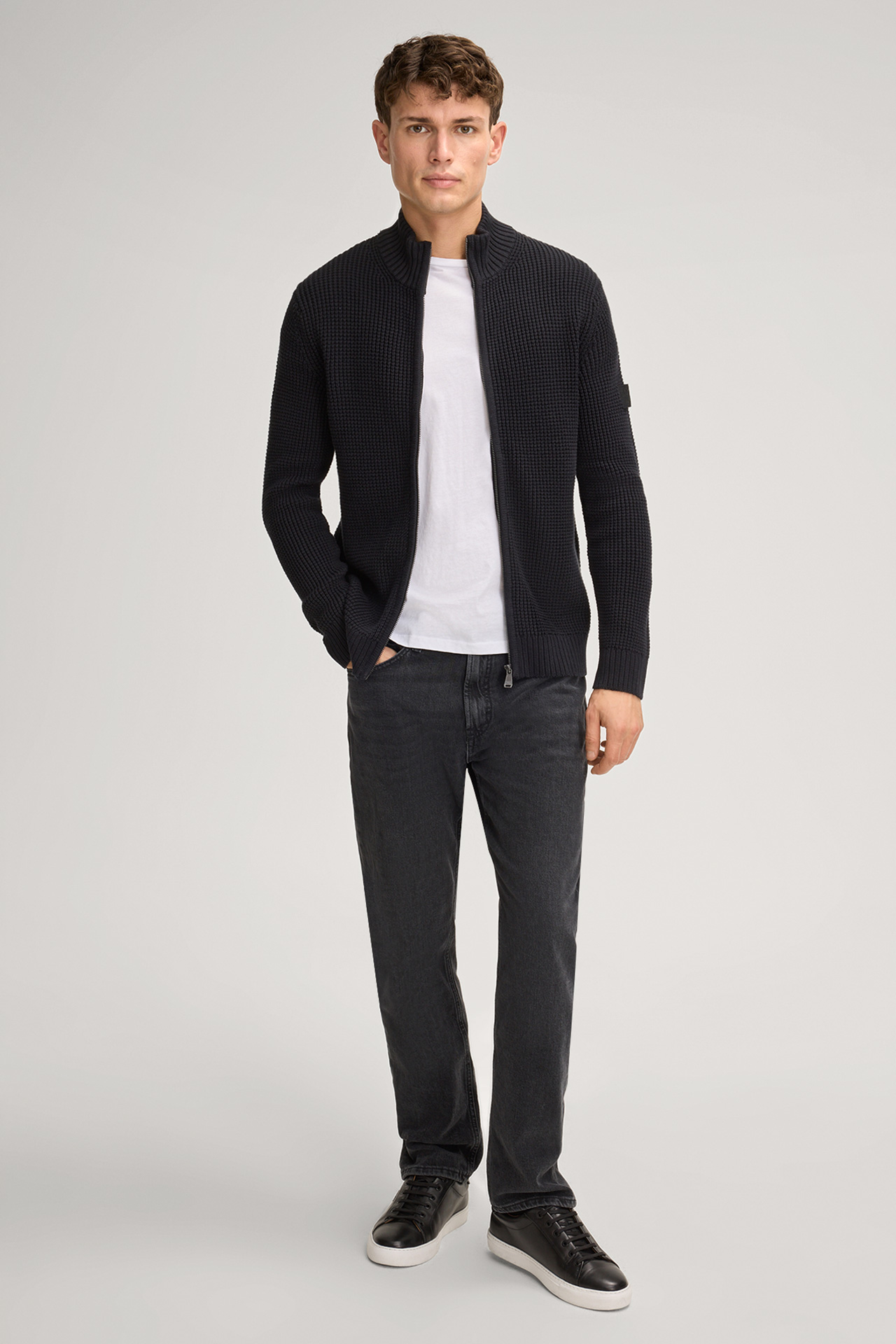 A stand-up collar, classic long sleeves and modern zip fastening give the Hajoros cardigan a stylish look. The design in textured waffle piqué makes it a highlight. A signature patch on the sleeve rounds off the item.