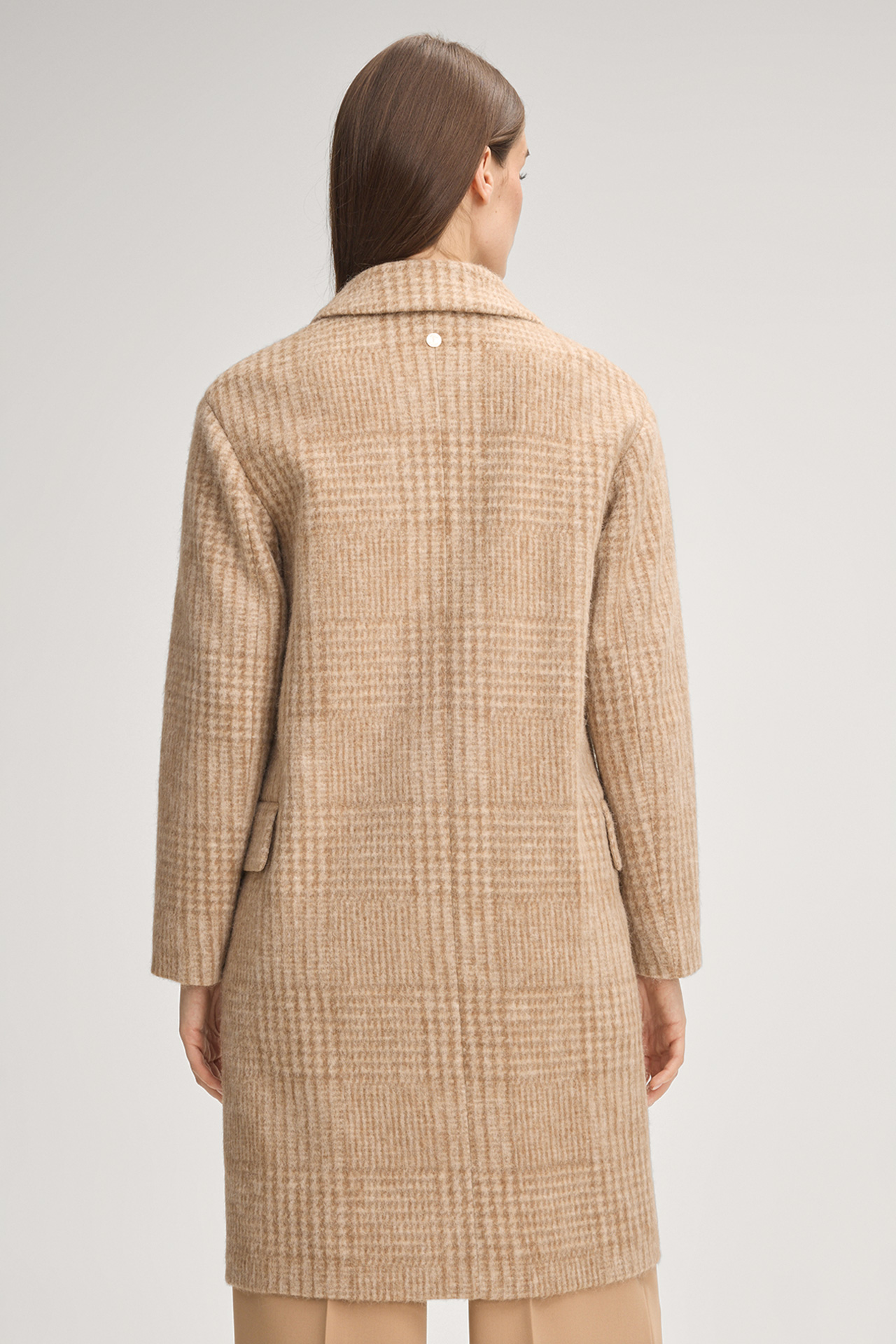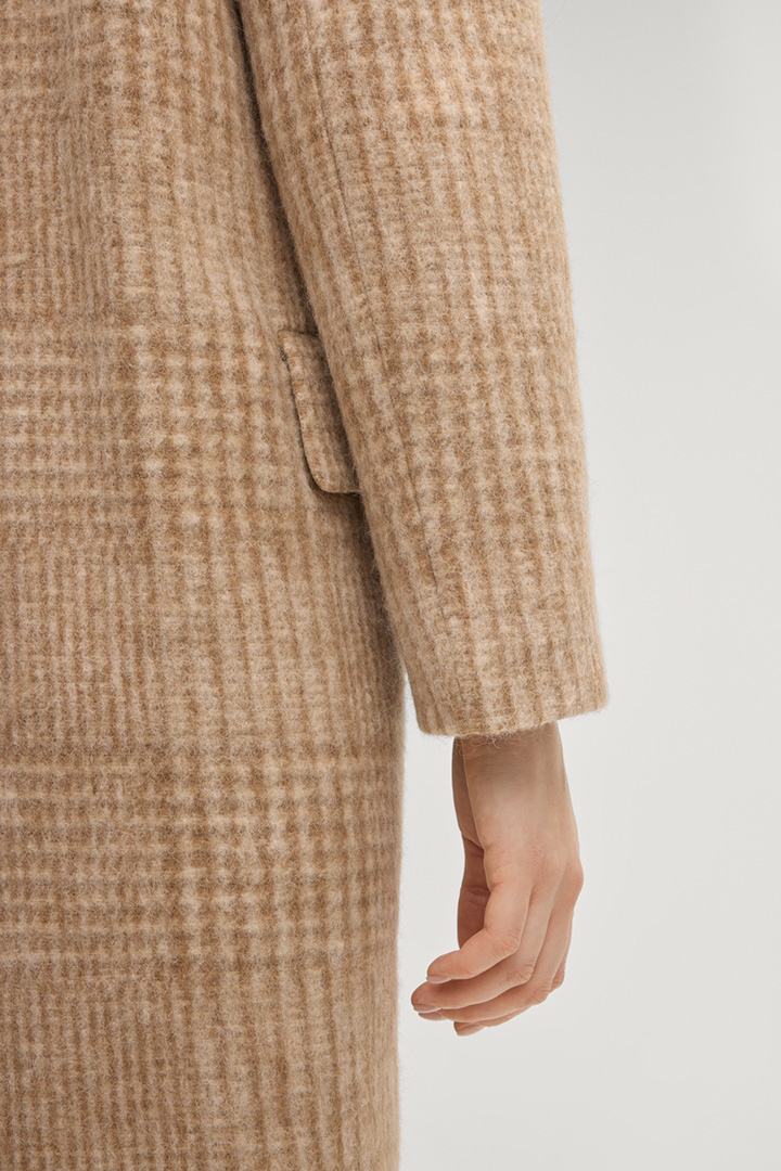 This wool jersey coat stands out as a modern piece with its classic lapel collar and button fastening. The checked pattern provides stylish highlights. Flap pockets ensure a comfortable finish.