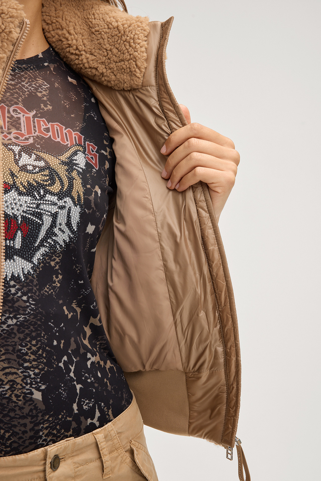 In topstitched teddy quality, the Vivian waistcoat adds a modern upgrade to the look. The design is highlighted by the stand-up collar and two-way zip, complemented by side pockets. The inset waistband at the hem lends a casual finish to the piece.