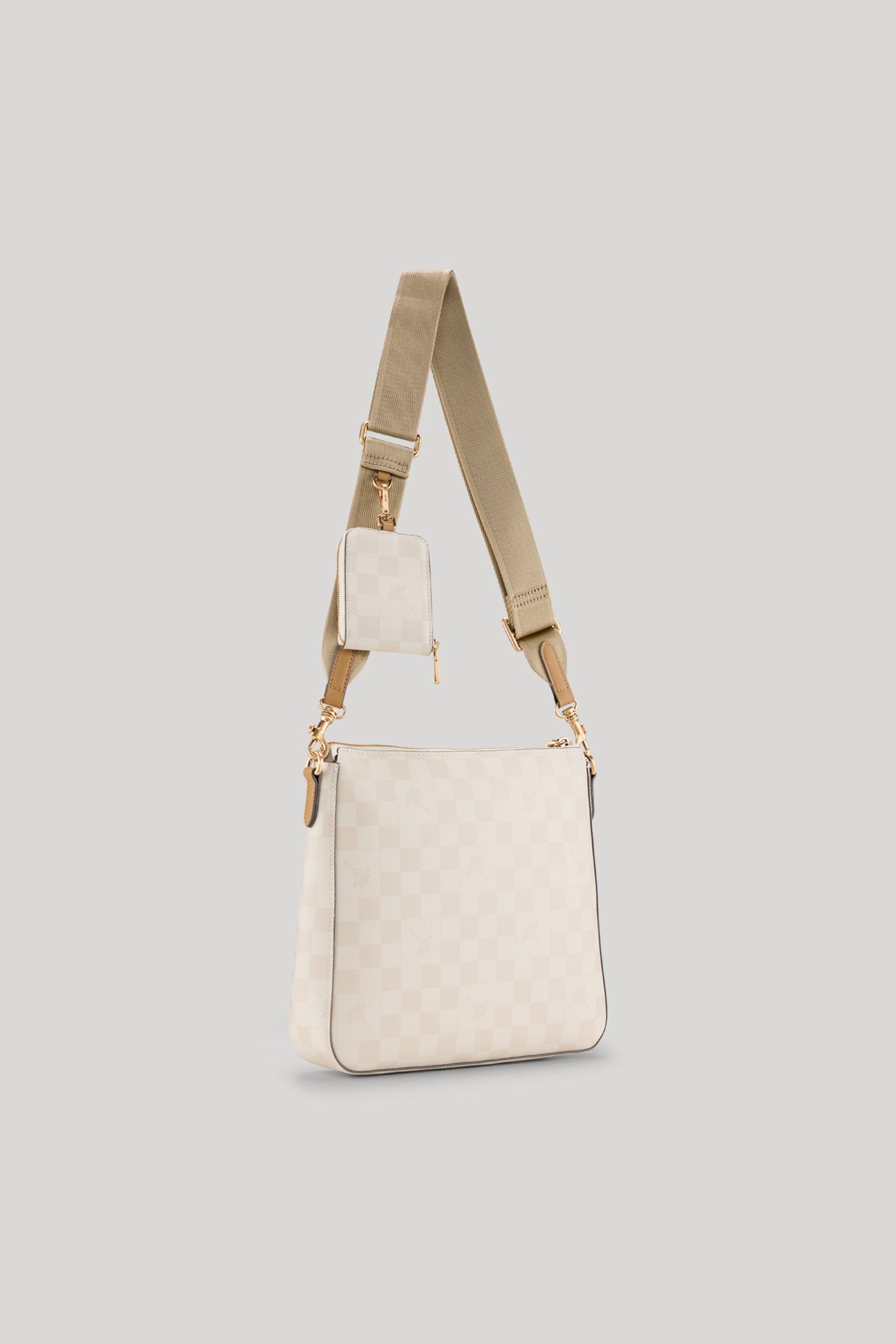 • adjustable textile crossbody strap with a carabiner clasp