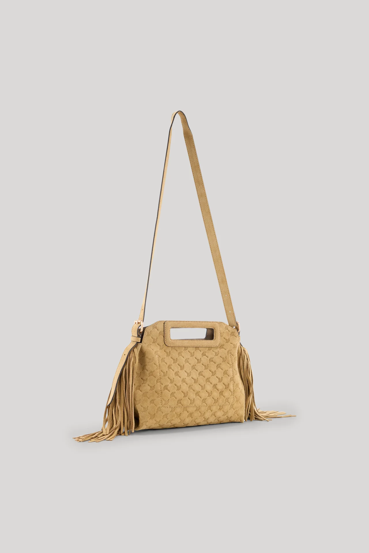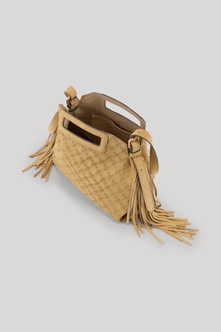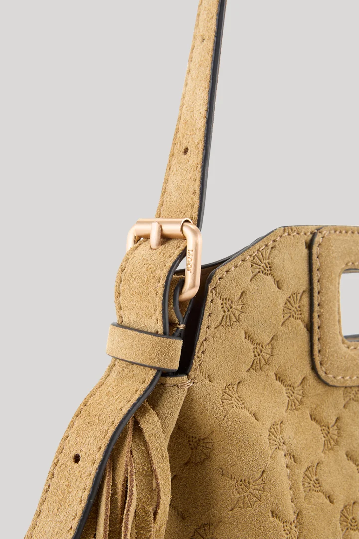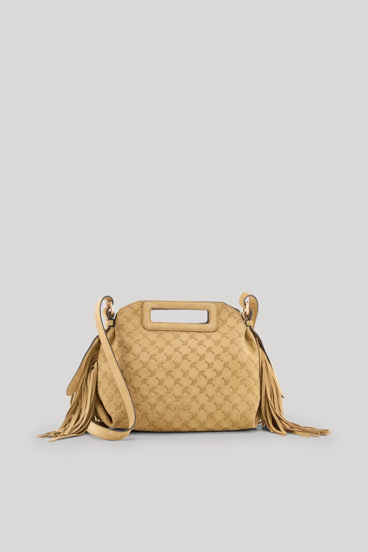 The pure leather quality in the embossed cornflower design gives the Frangia Dolce Morgan handbag a sophisticated look. Two short handles and the adjustable shoulder strap in a classical belt style complete the accessory. Expressive accents are provided by fringed details on the sides, whilst the metallic signature adds a distinctive twist. The inlay with a concealed magnetic fastening and additional slip pocket harmoniously rounds off this elegant piece.