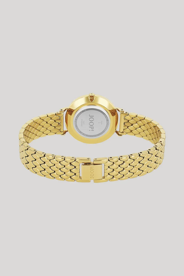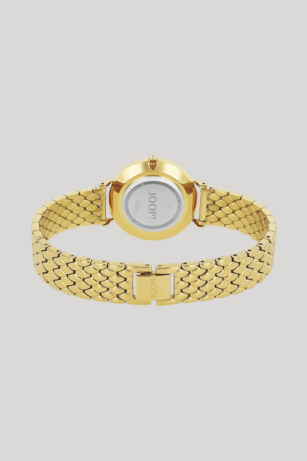 With a luxurious twist, this gleaming gold ladies’ wristwatch, crafted from pure stainless steel, features an accurate TMI movement and a modern, nuanced dial. Mineral glass provides a high-quality finish, rounded off by the elegant jeweller’s clasp. The round design looks aesthetically pleasing and complements the new jewellery collection as a feminine eyecatcher.