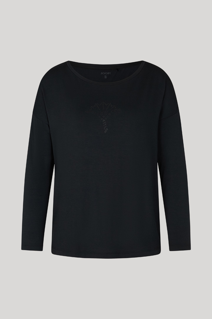 The stretchy modal quality marks out this long-sleeved top as a comfortable piece for relaxed looks, complemented by dropped shoulders and a classic round neckline. The cornflower designed in fine gemstones provides a signature accent.